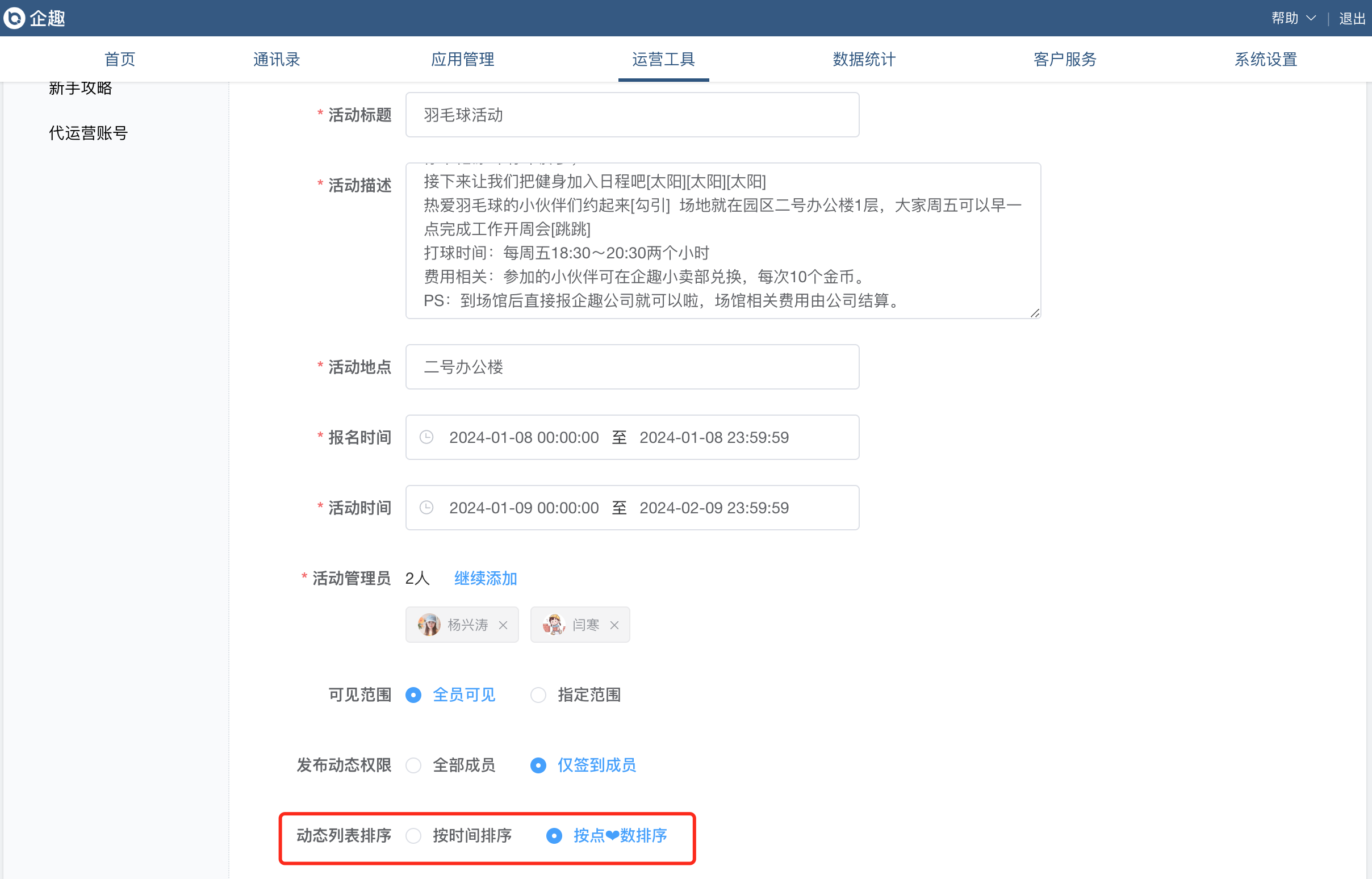 ③活动吧动态列表支持按照点赞数排序;