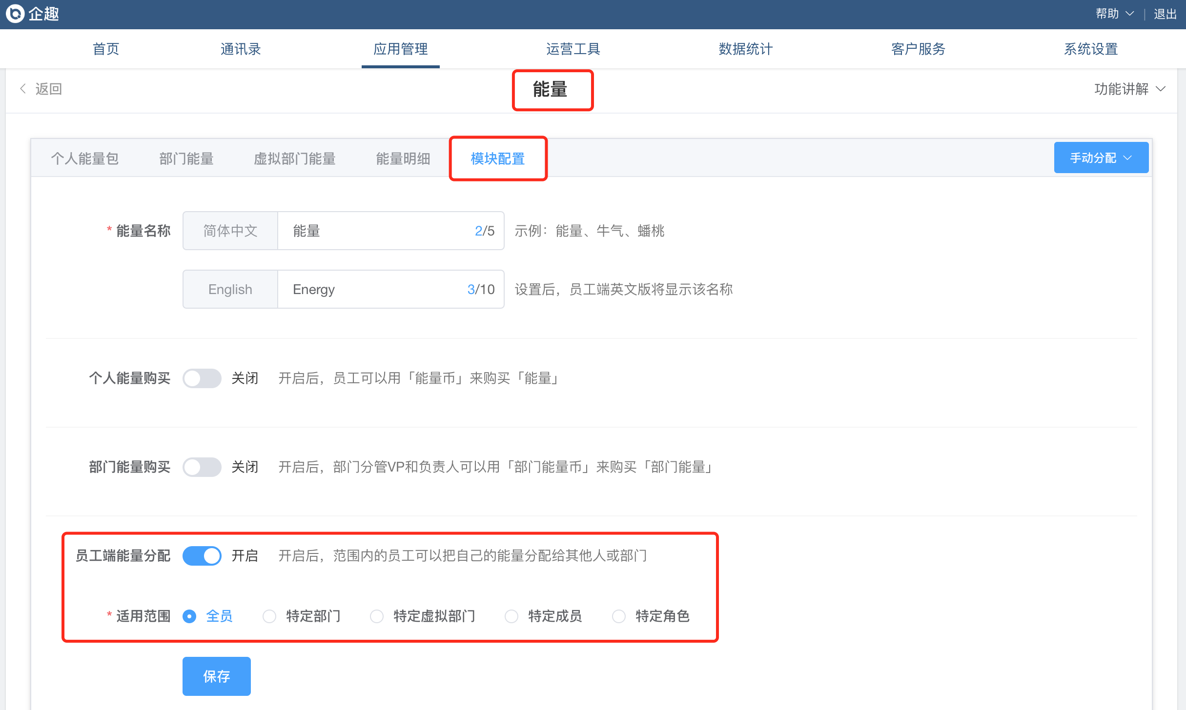 ②员工端能量分配支持选择全员;