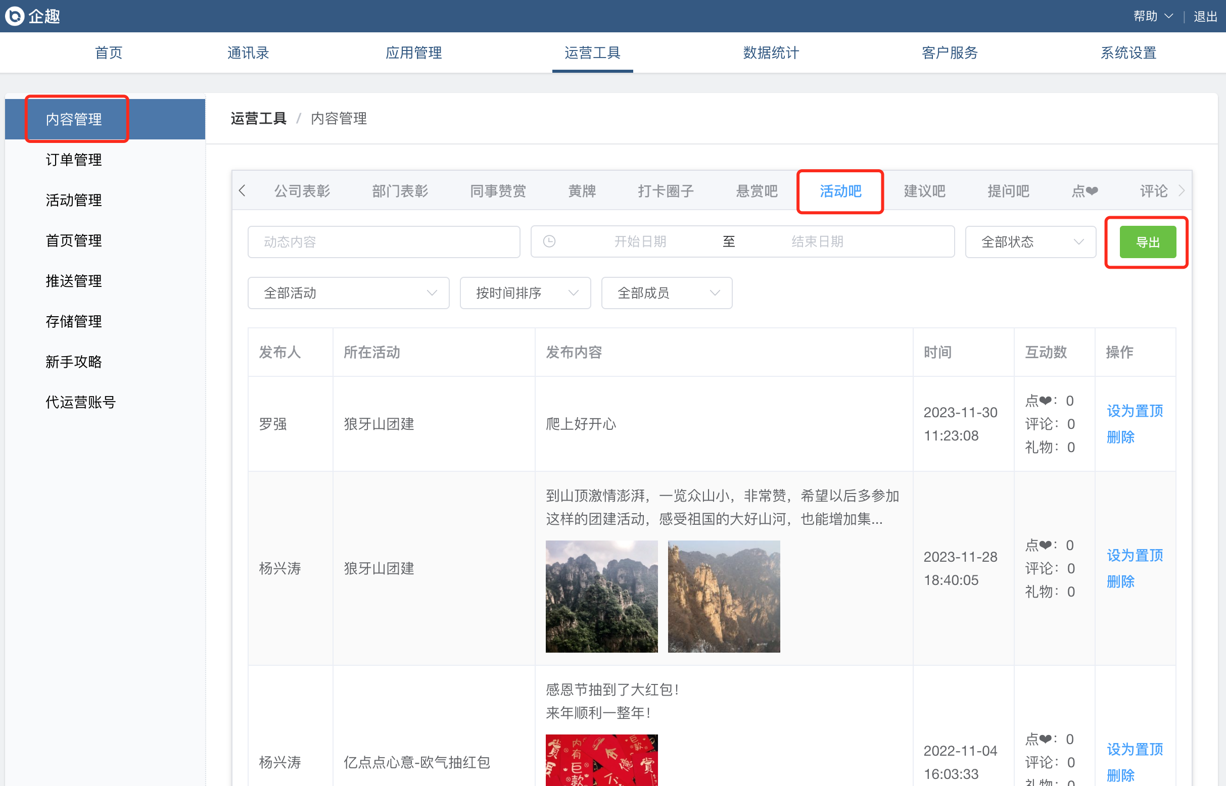 ④内容管理增加活动动态数据并支持导出;