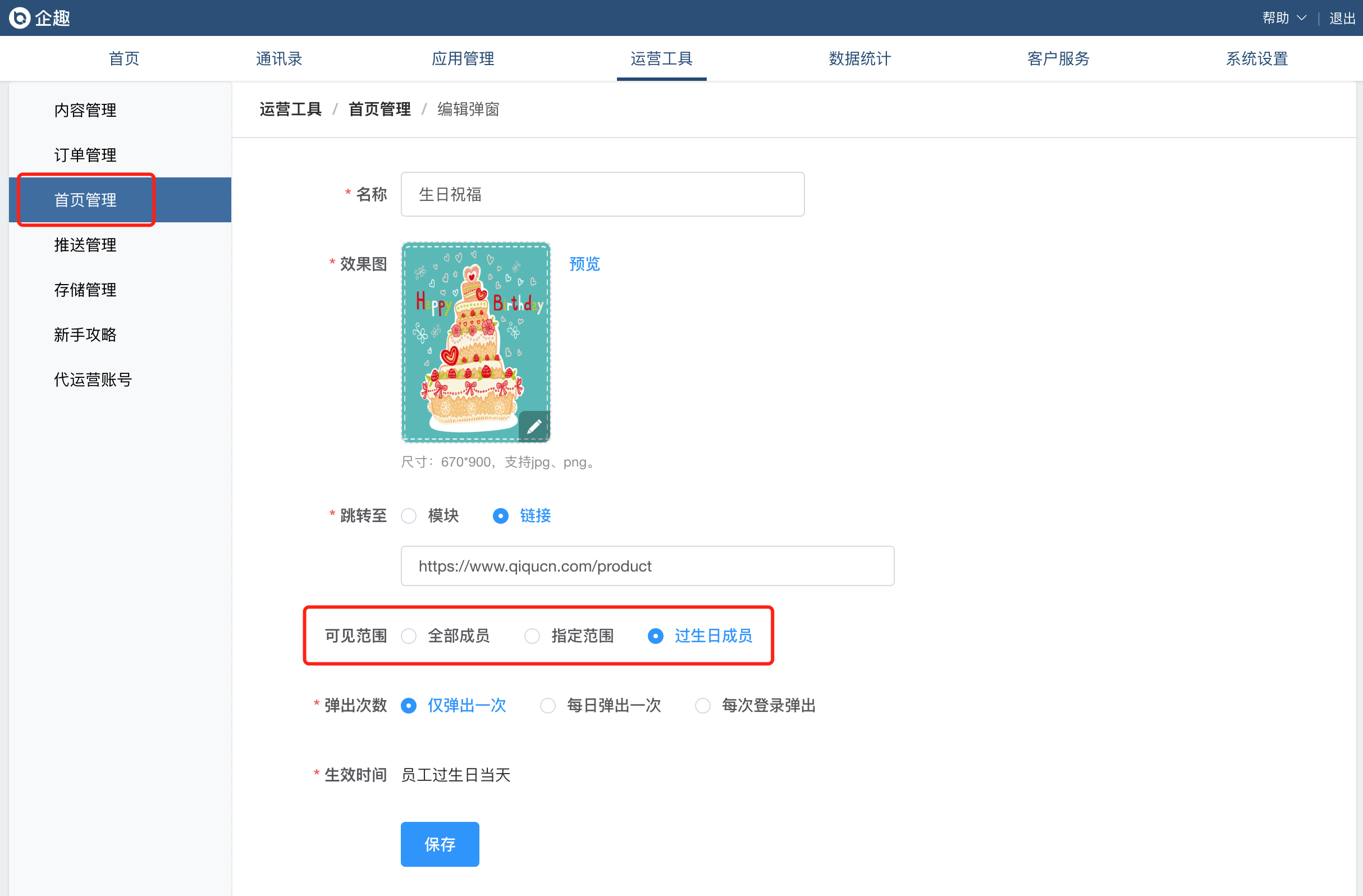 ①首页弹窗支持选择可见范围;