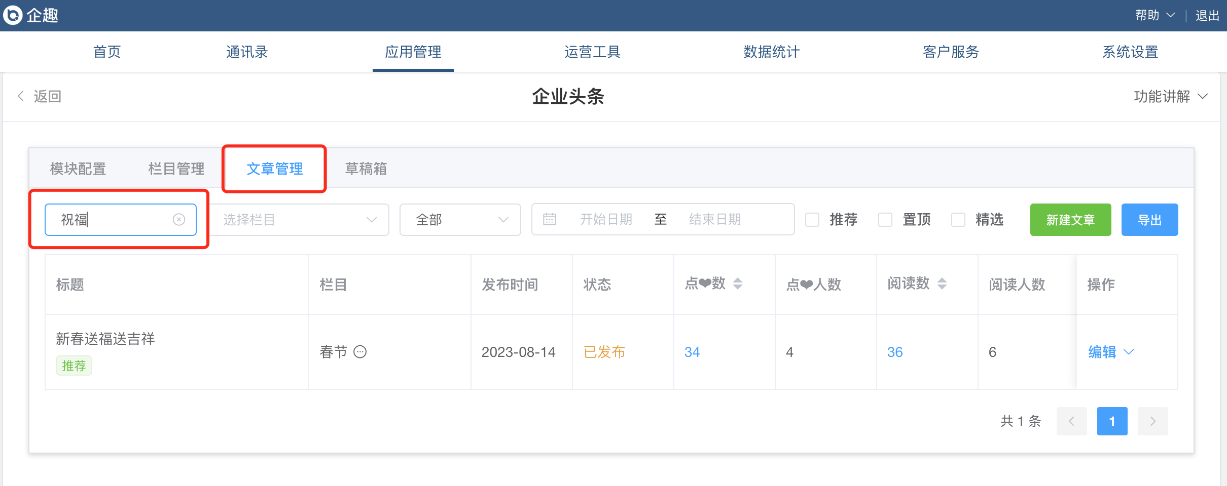 ③管理后台企业头条支持搜索文章;
