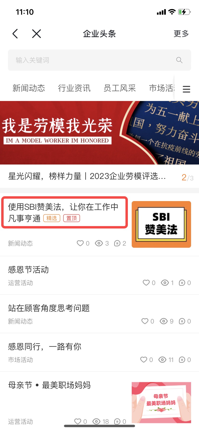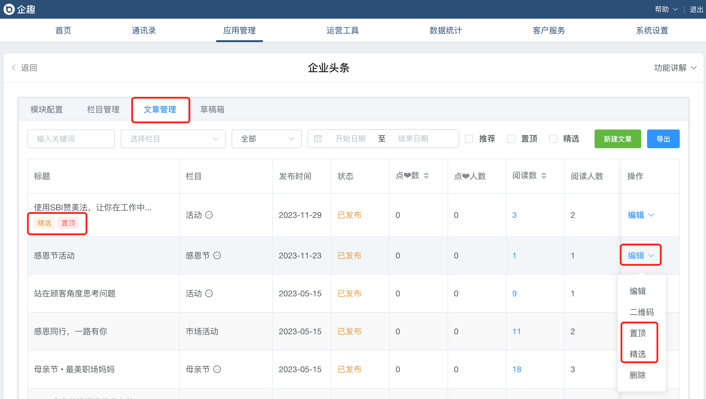 ④企业头条文章支持置顶、精选