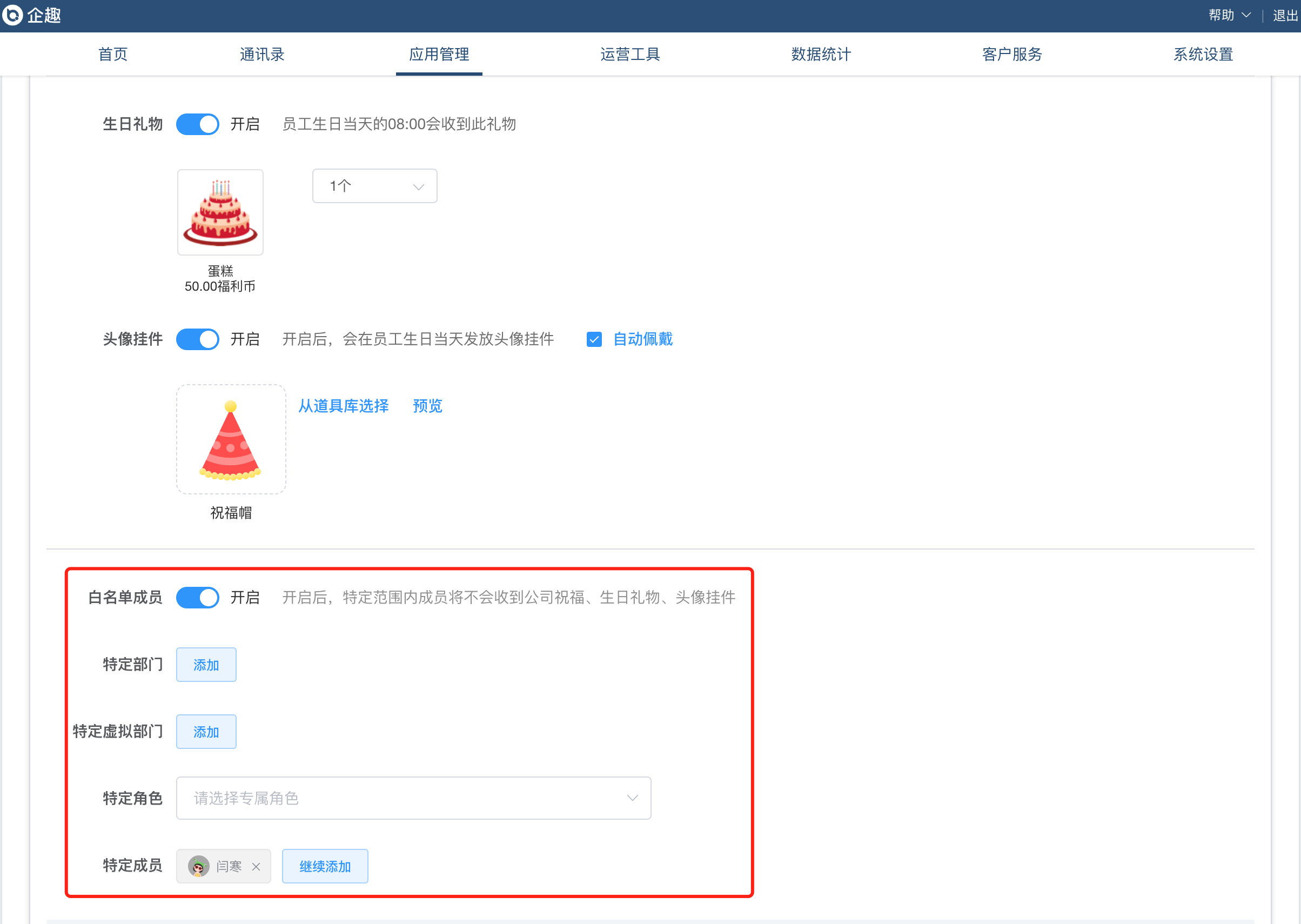 ②生日榜支持配置白名单成员不发放祝福和礼物;