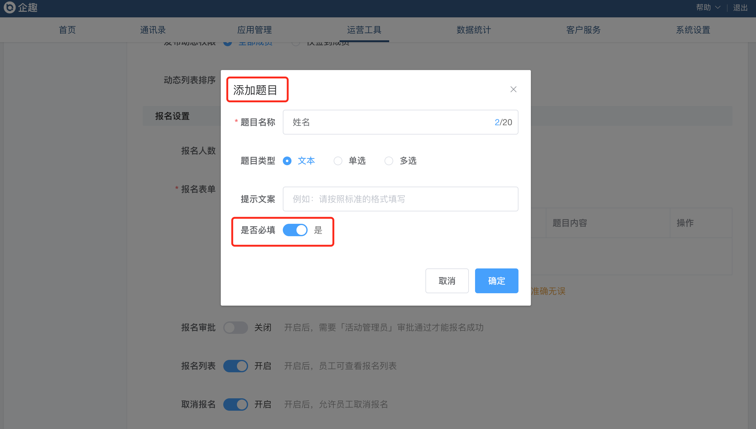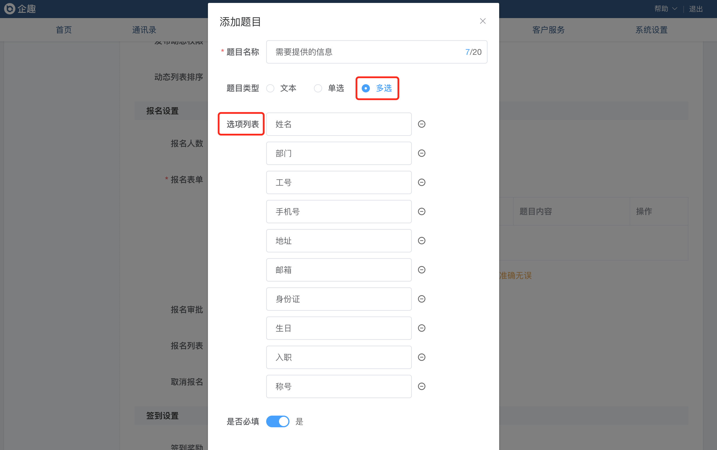 ③活动吧报名题目,支持配置是否必填