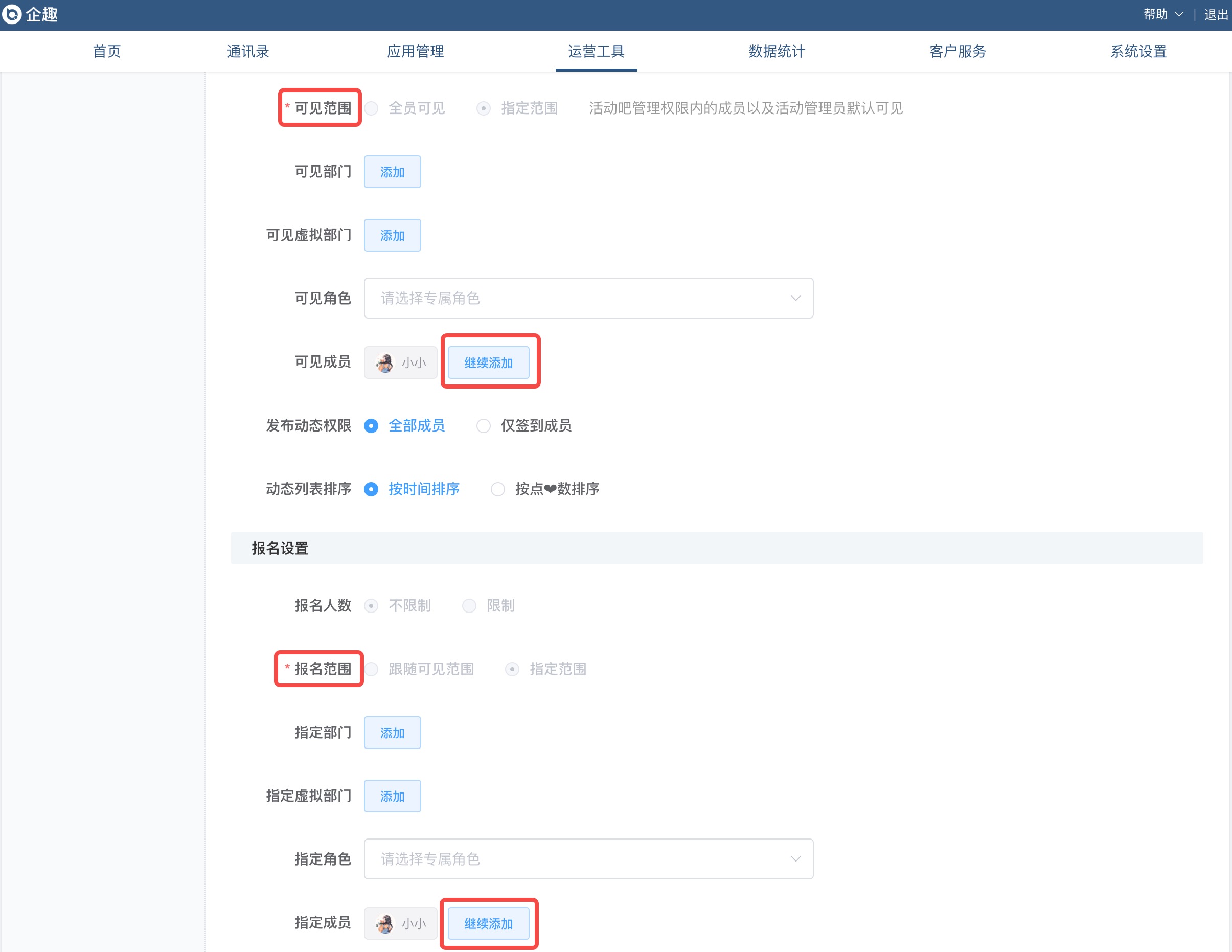 ②活动吧产生报名数据后,支持继续添加可见范围、报名范围