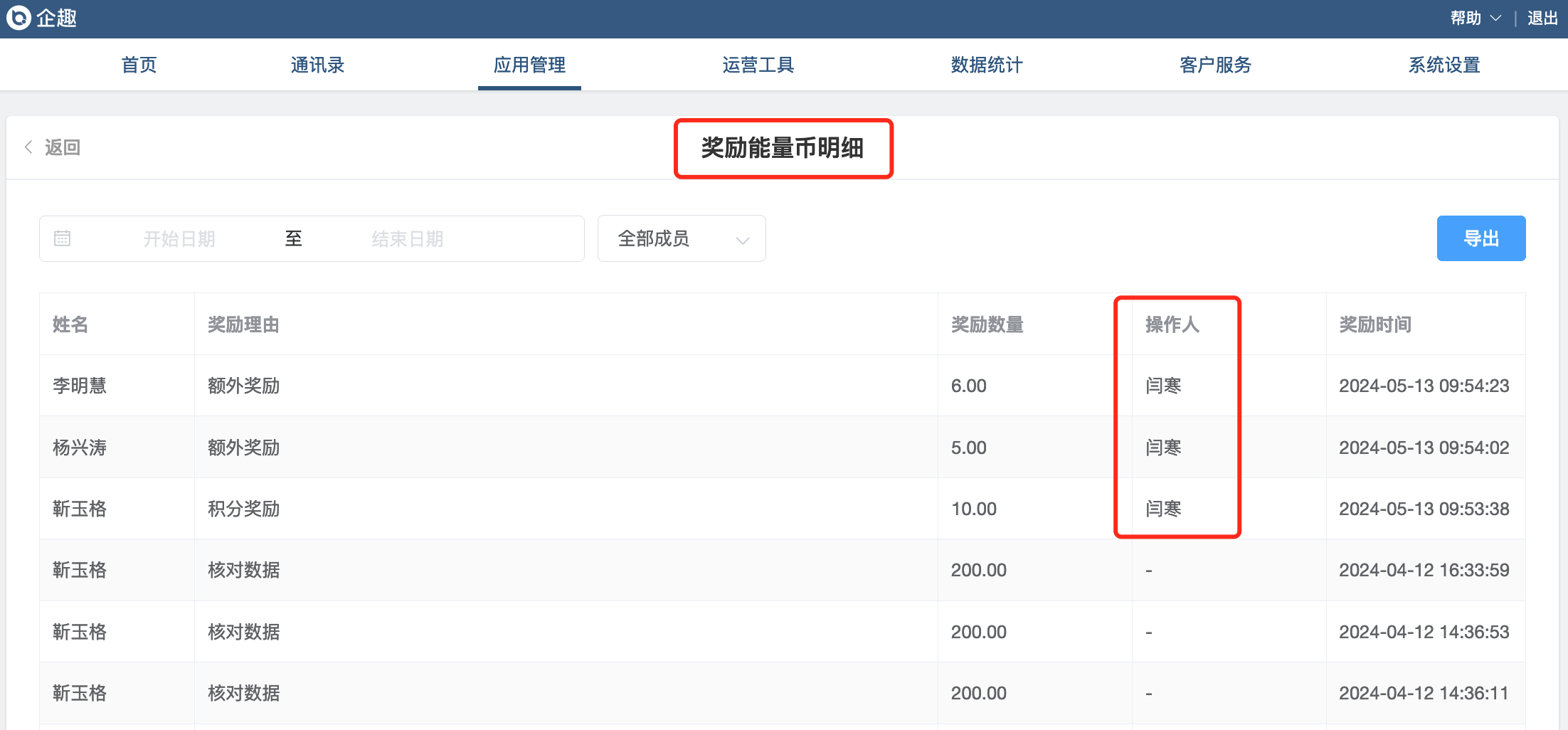①奖励积分明细列表增加操作人;