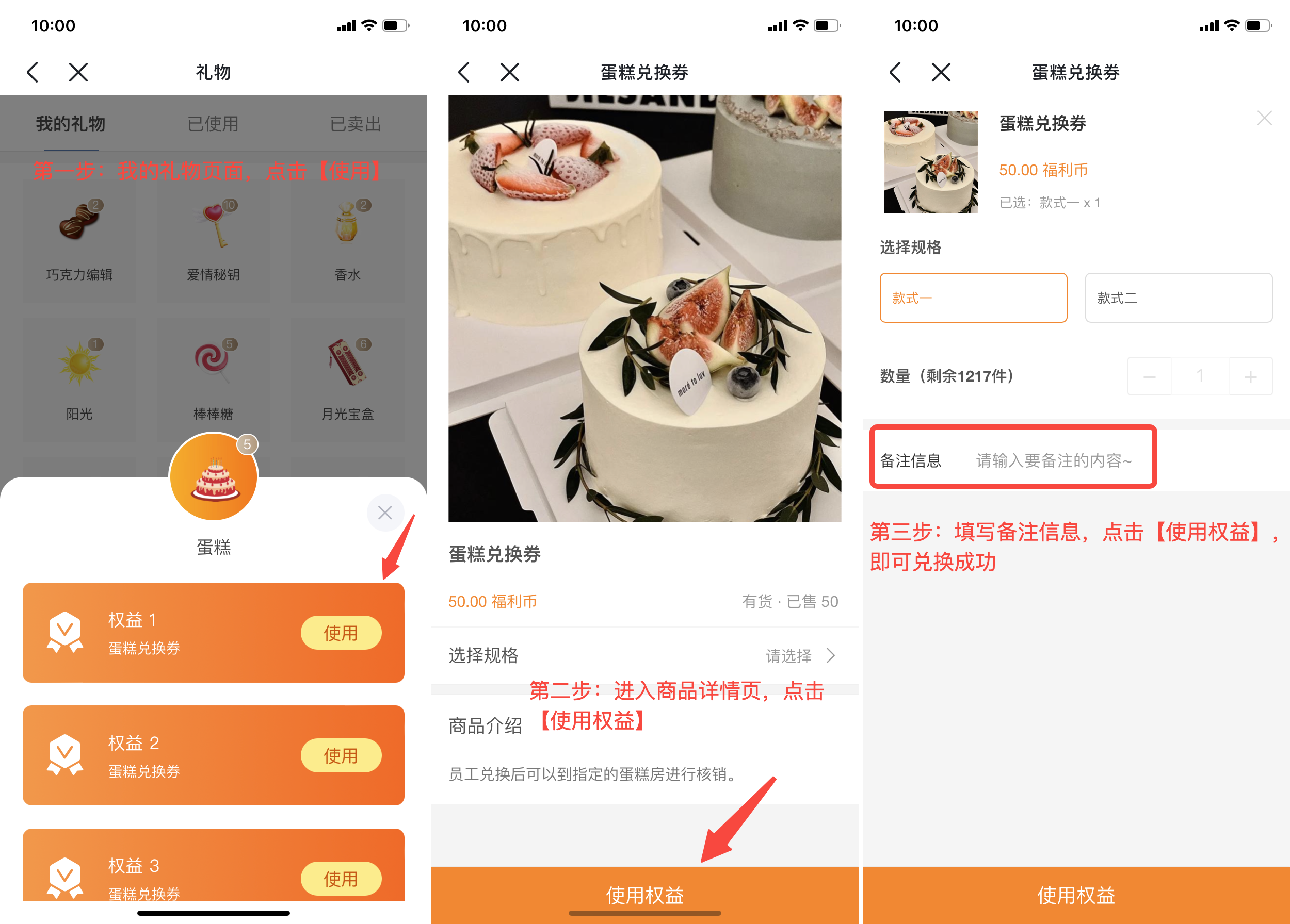 使用礼物权益兑换商品时,支持填写备注信息