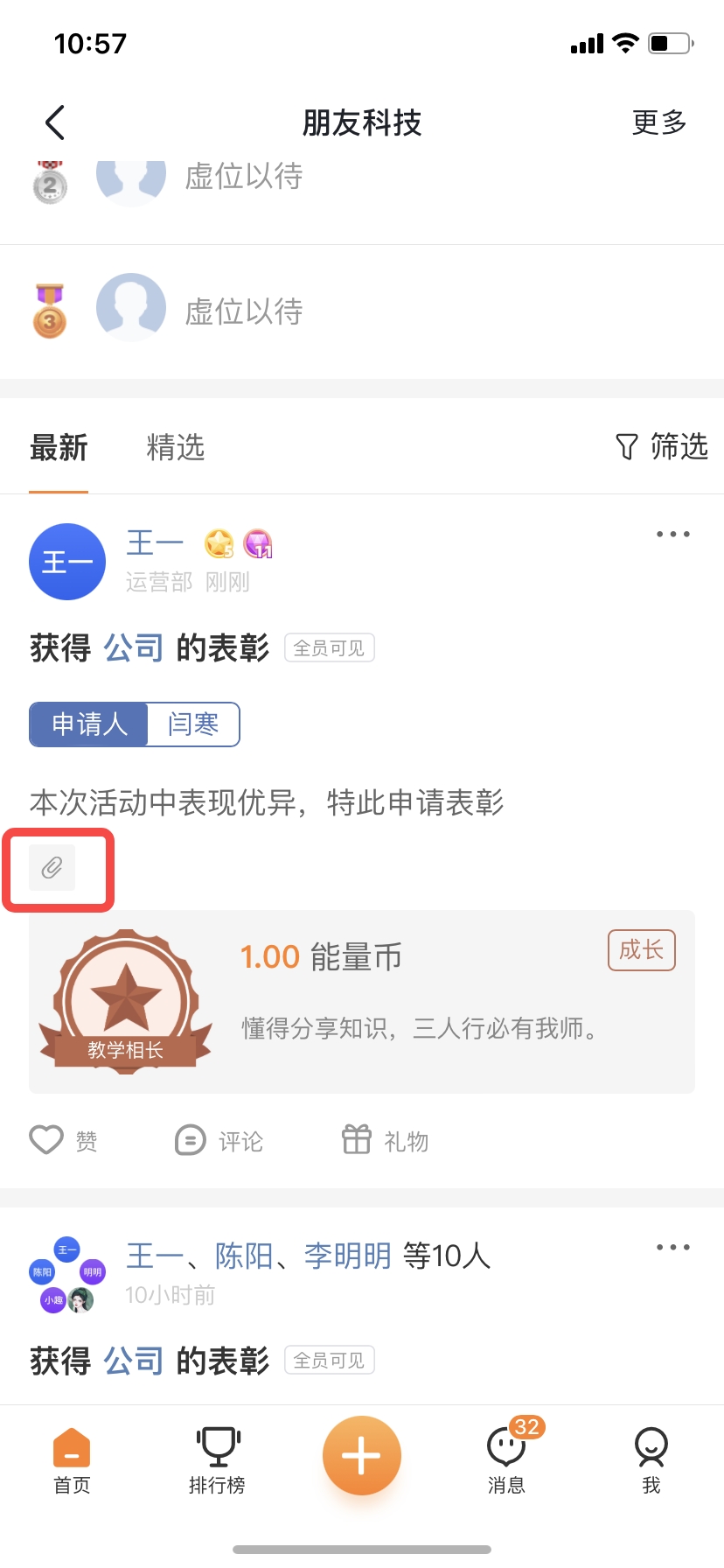 ②打卡圈子、悬赏吧、申请表彰上传附件后,首页信息流增加附件标识;