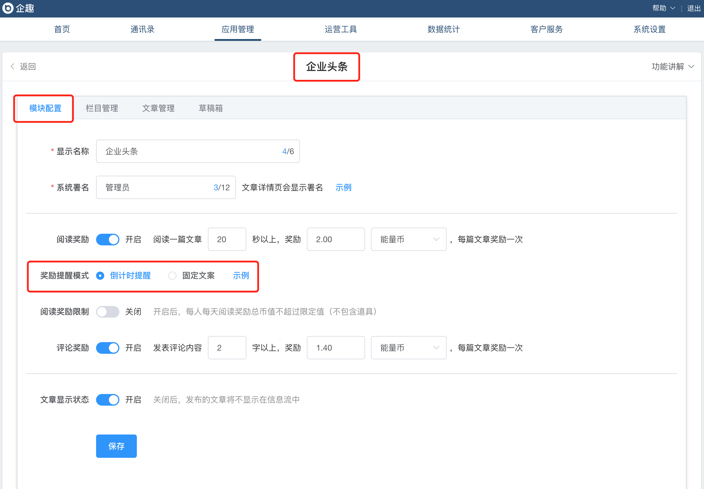 ①企业头条增加奖励提醒模式;