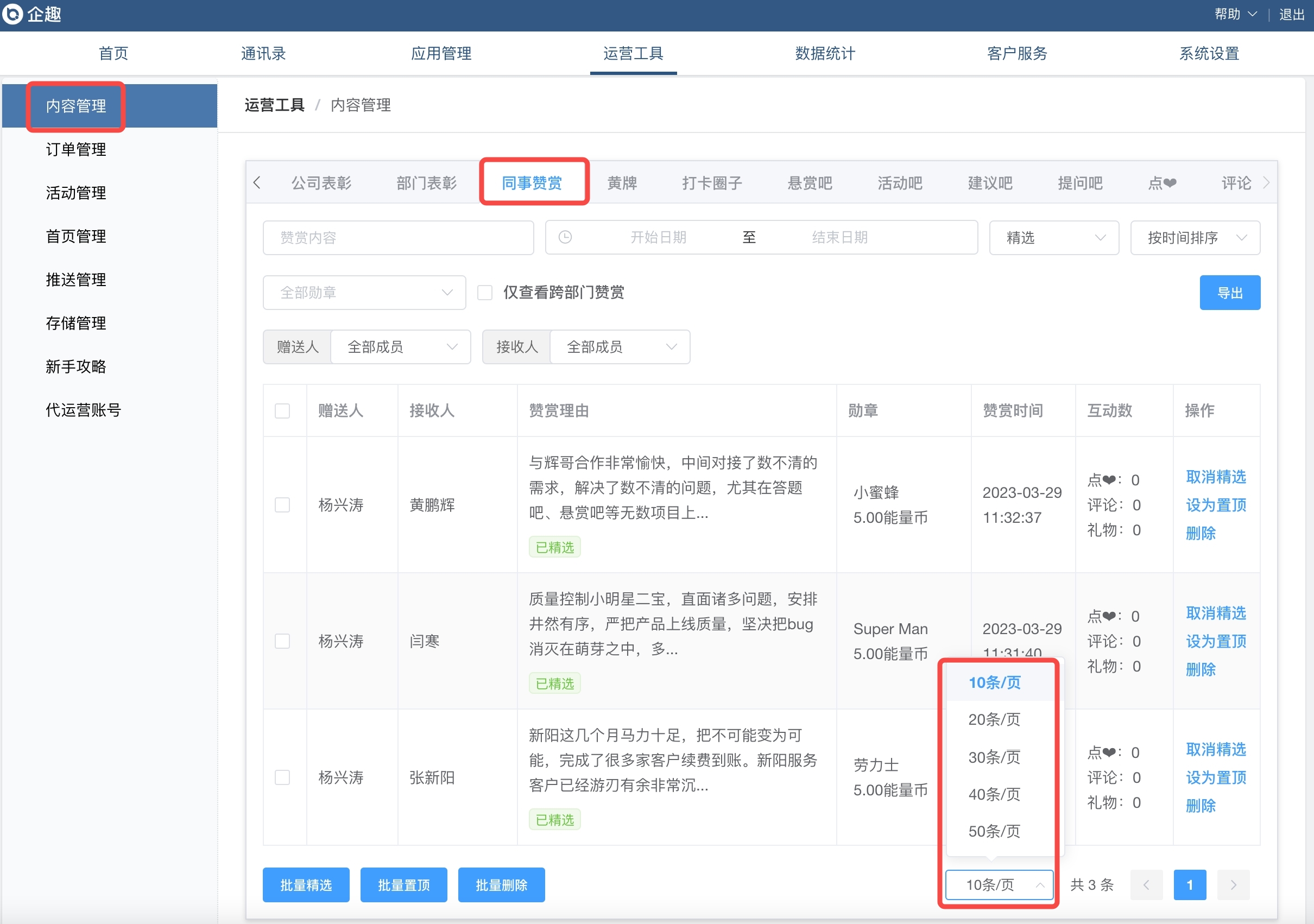 ①内容管理,数据列表页面,支持设置每页查看条数;