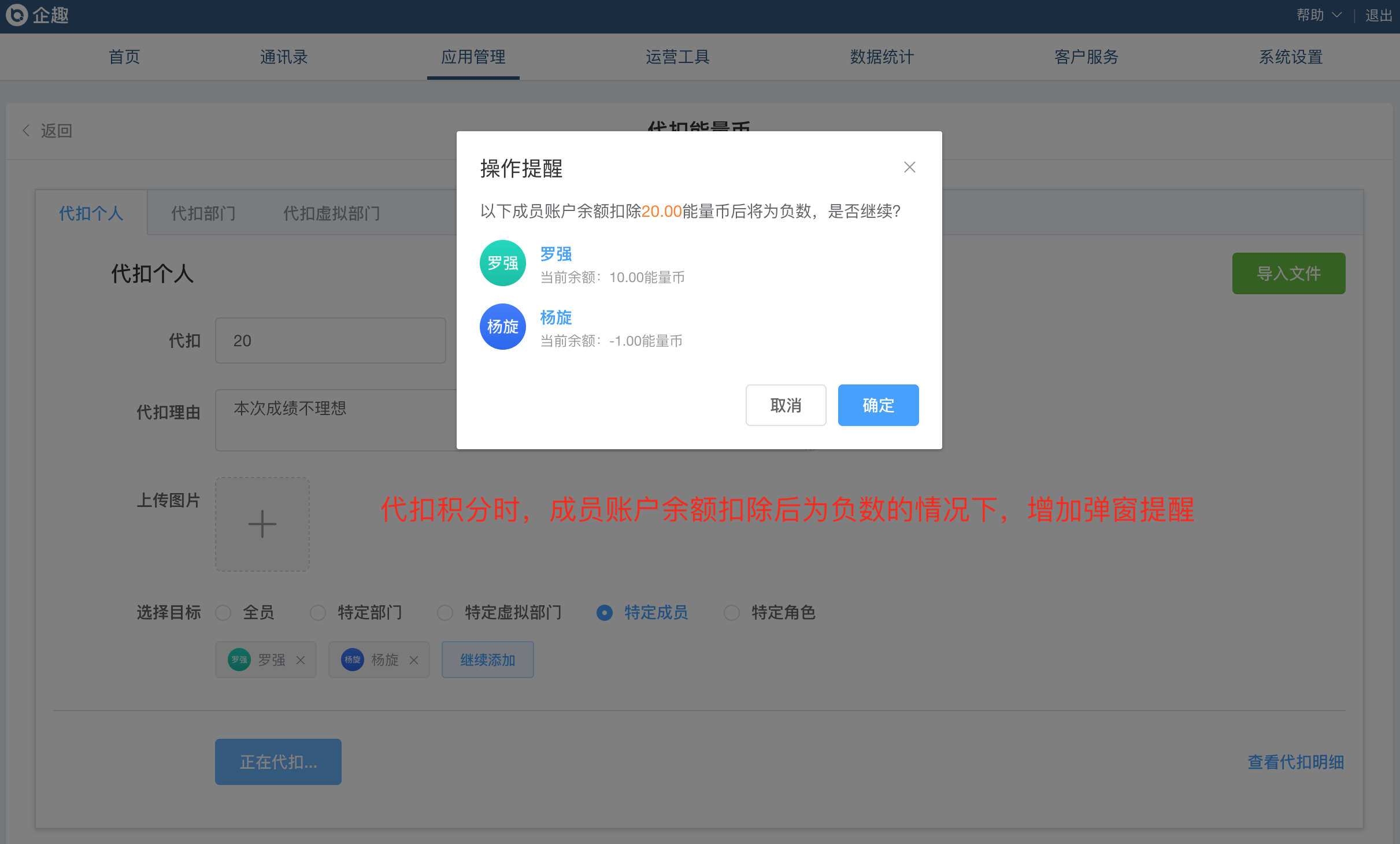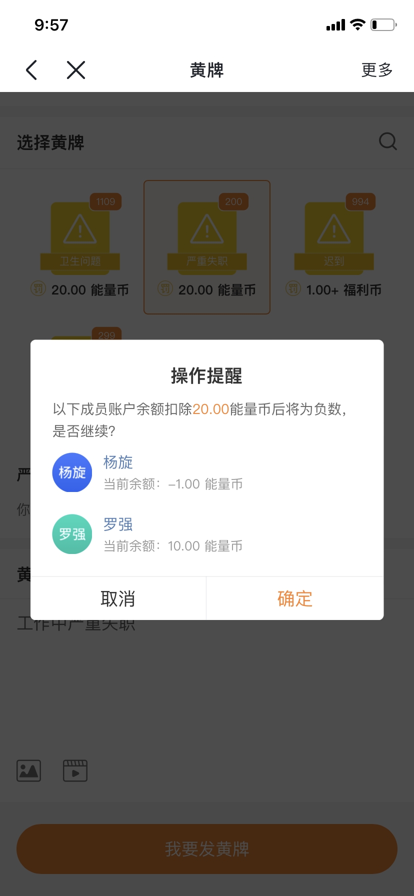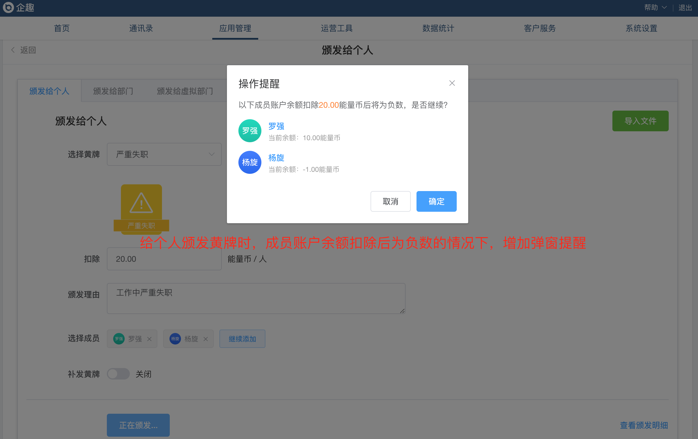 ②颁发黄牌、代扣积分时增加员工余额负数弹窗提醒;