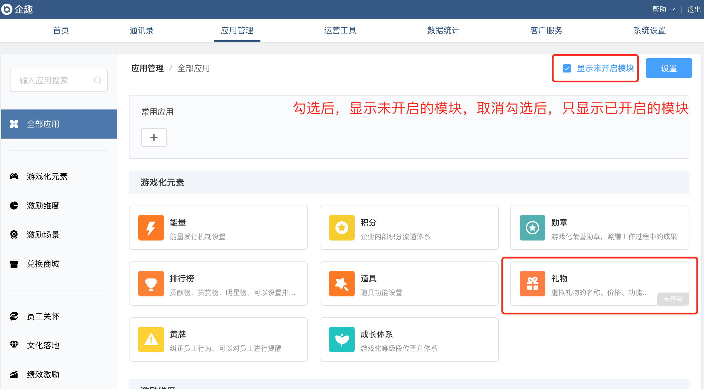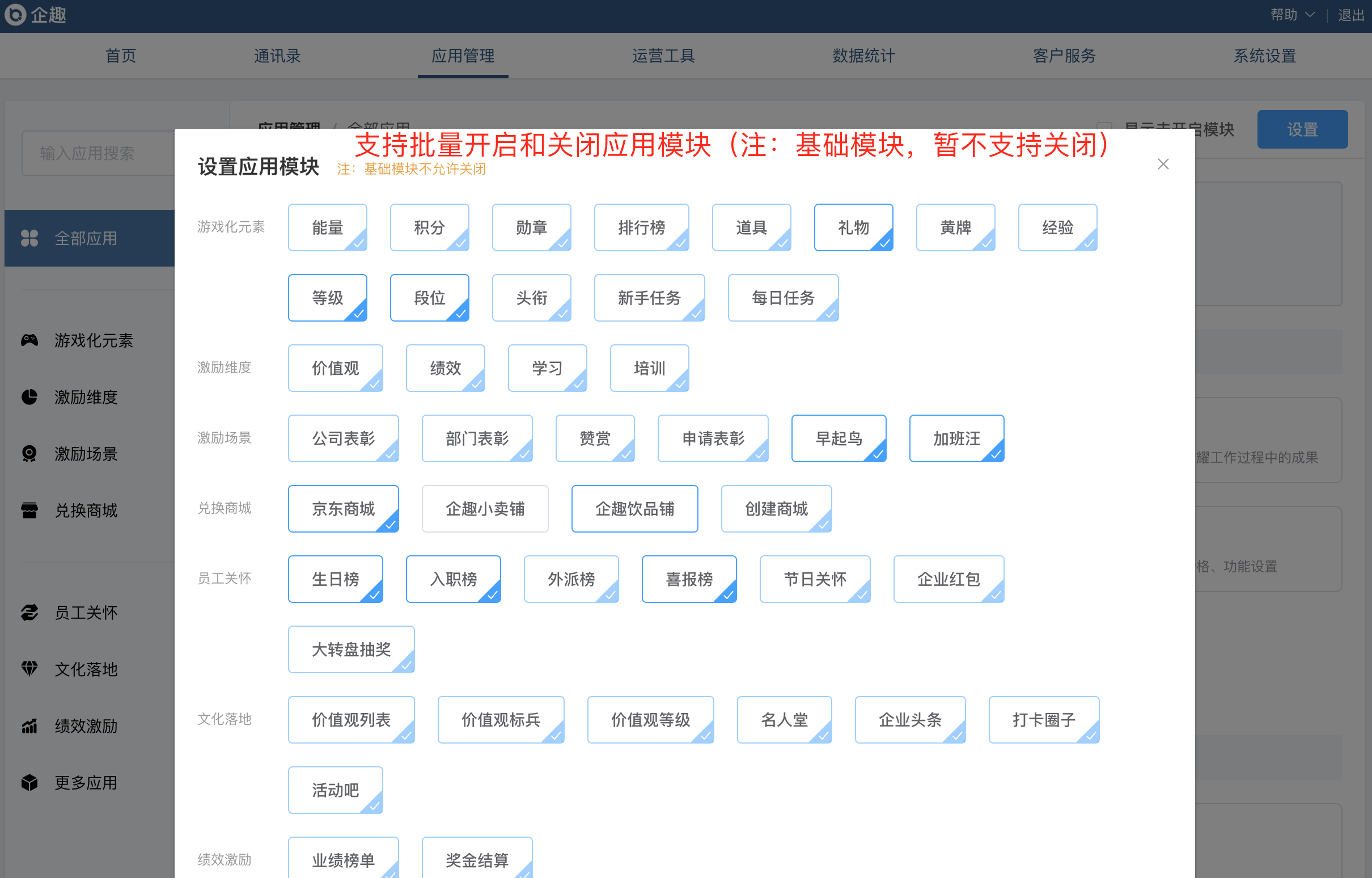 ②应用管理界面支持隐藏「未开启模块」,并支持批量开启和关闭部分应用模块