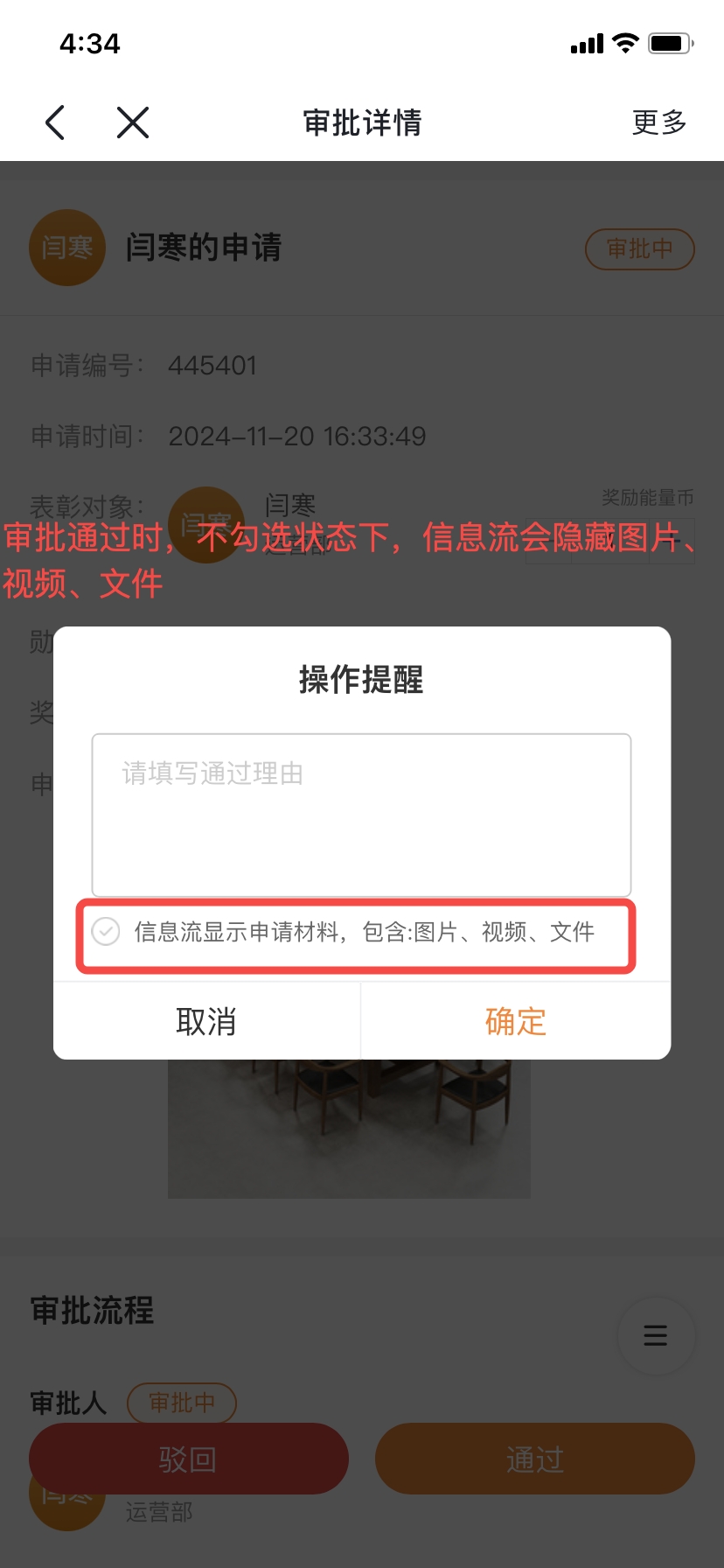 ②申请公司表彰,审批通过时,支持配置隐藏信息流图片、视频、文件