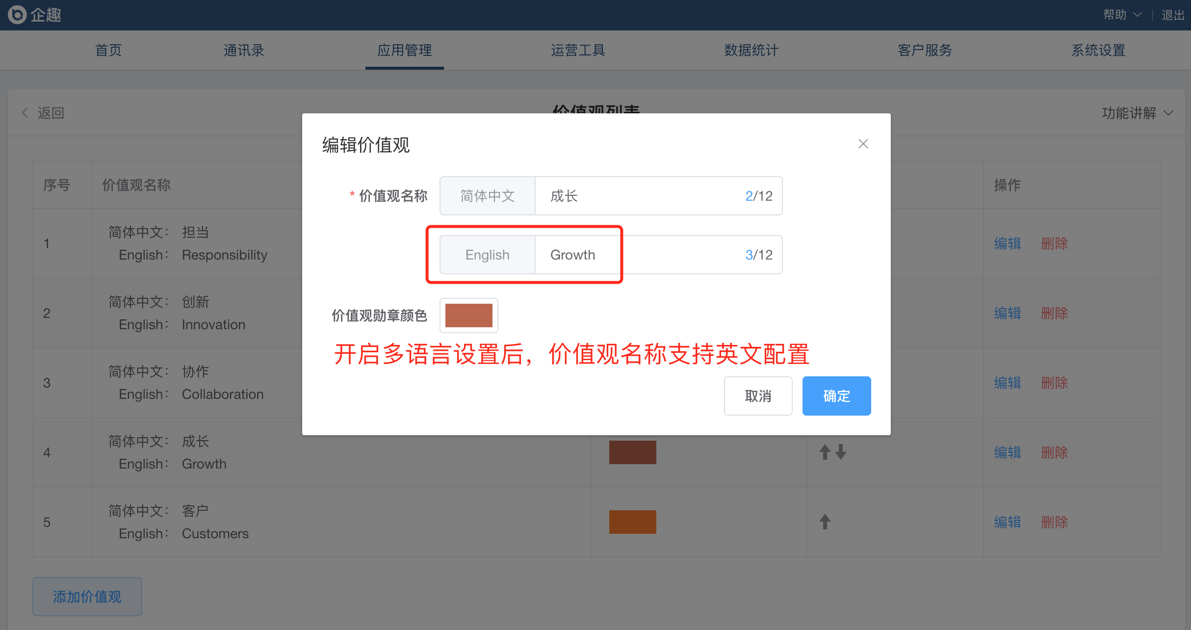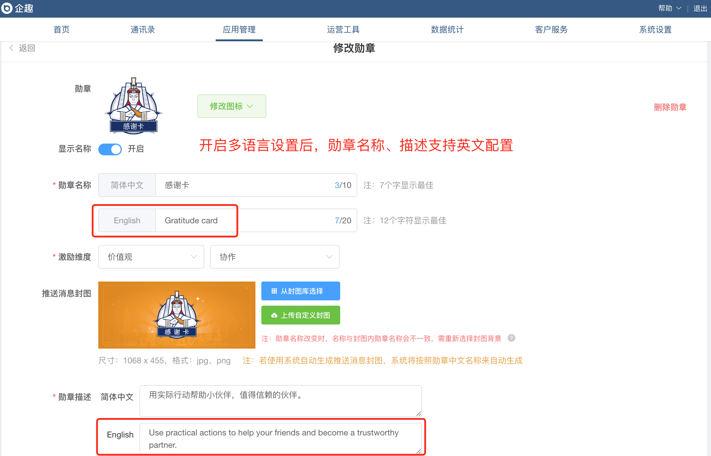 ①开启多语言设置后,勋章名称、勋章描述、价值观名称增加英文配置;