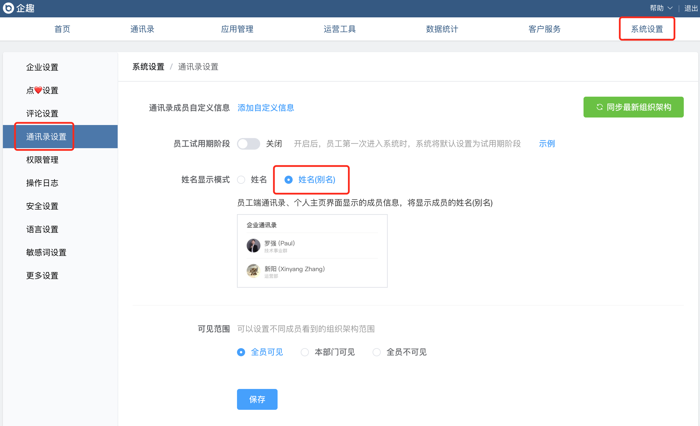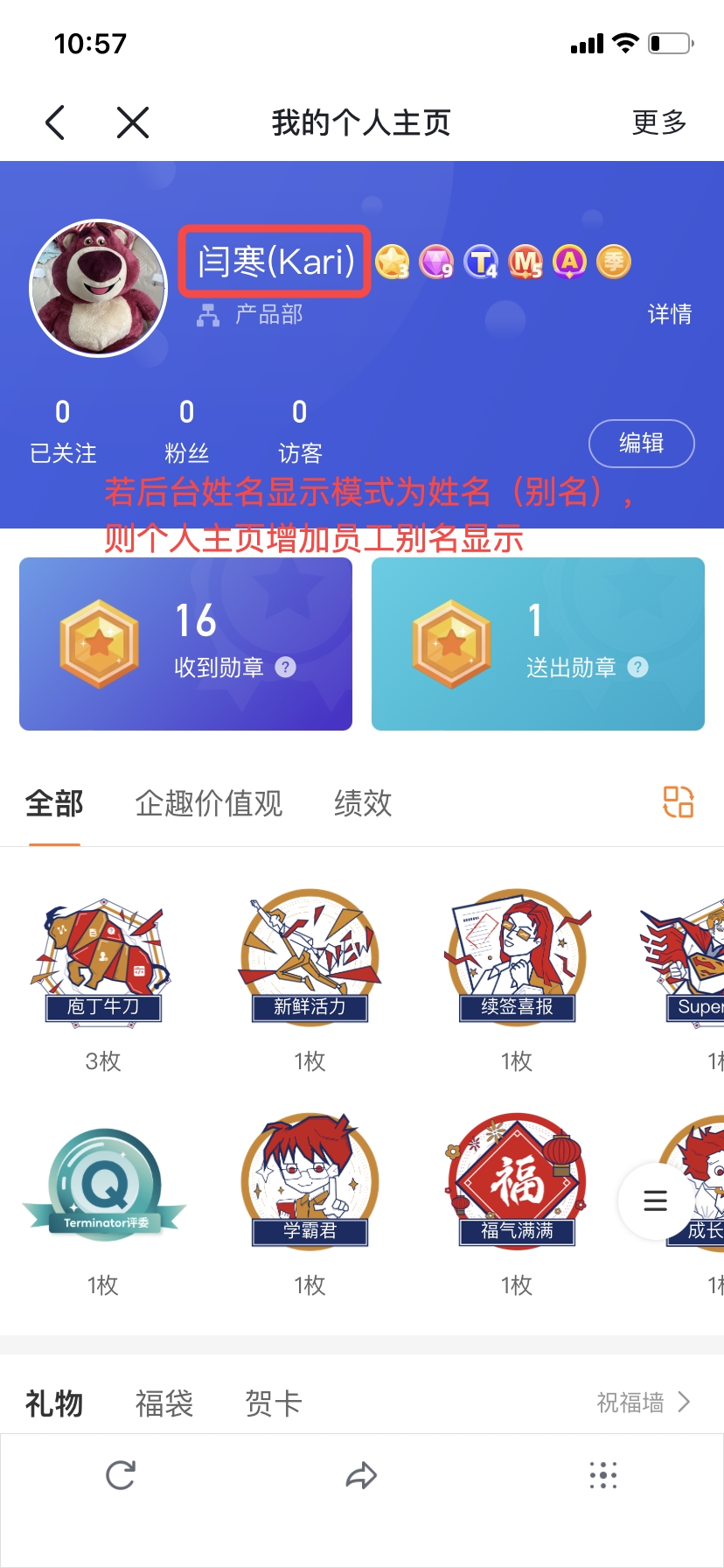 ①个人主页增加员工别名显示;
