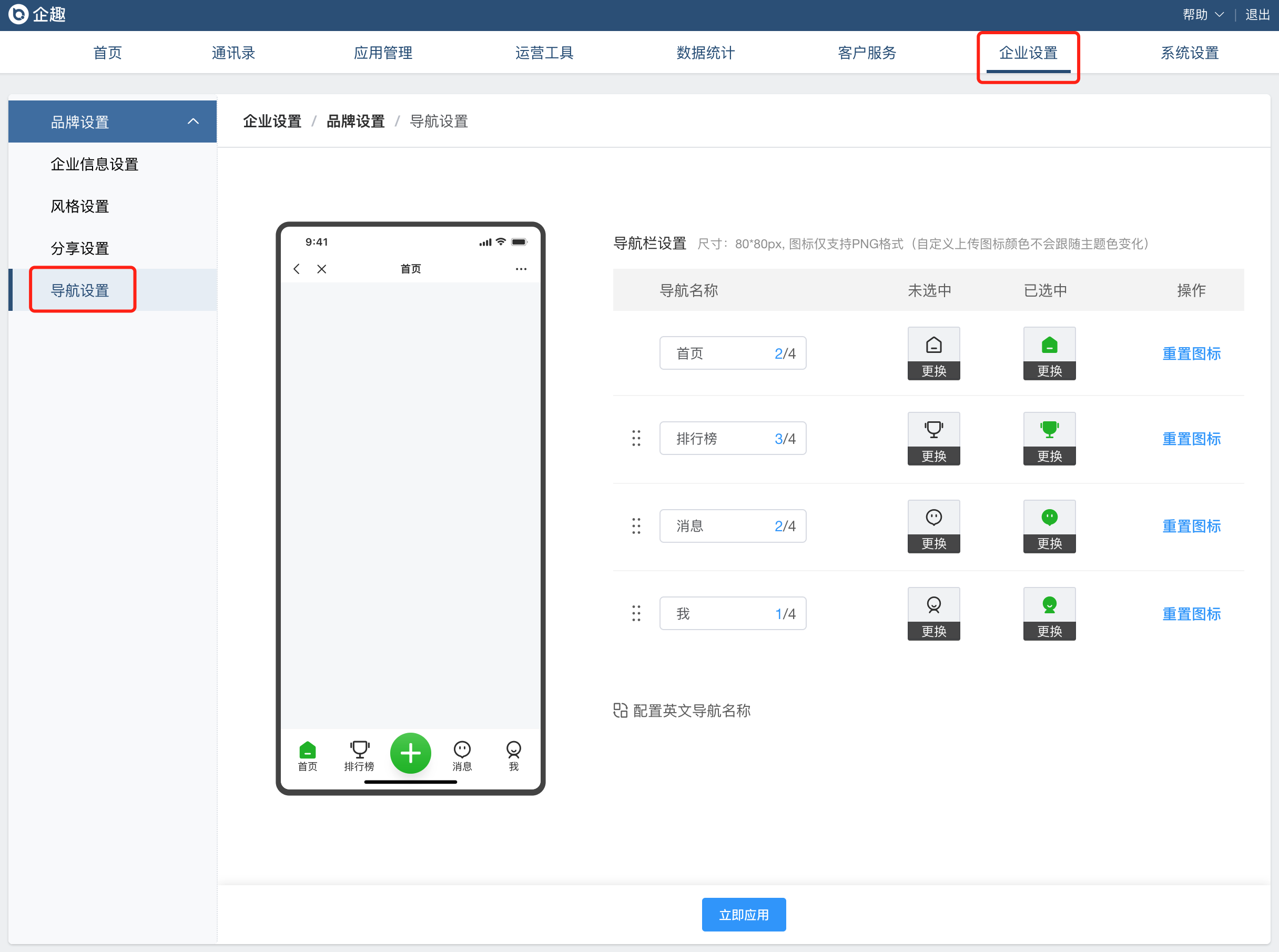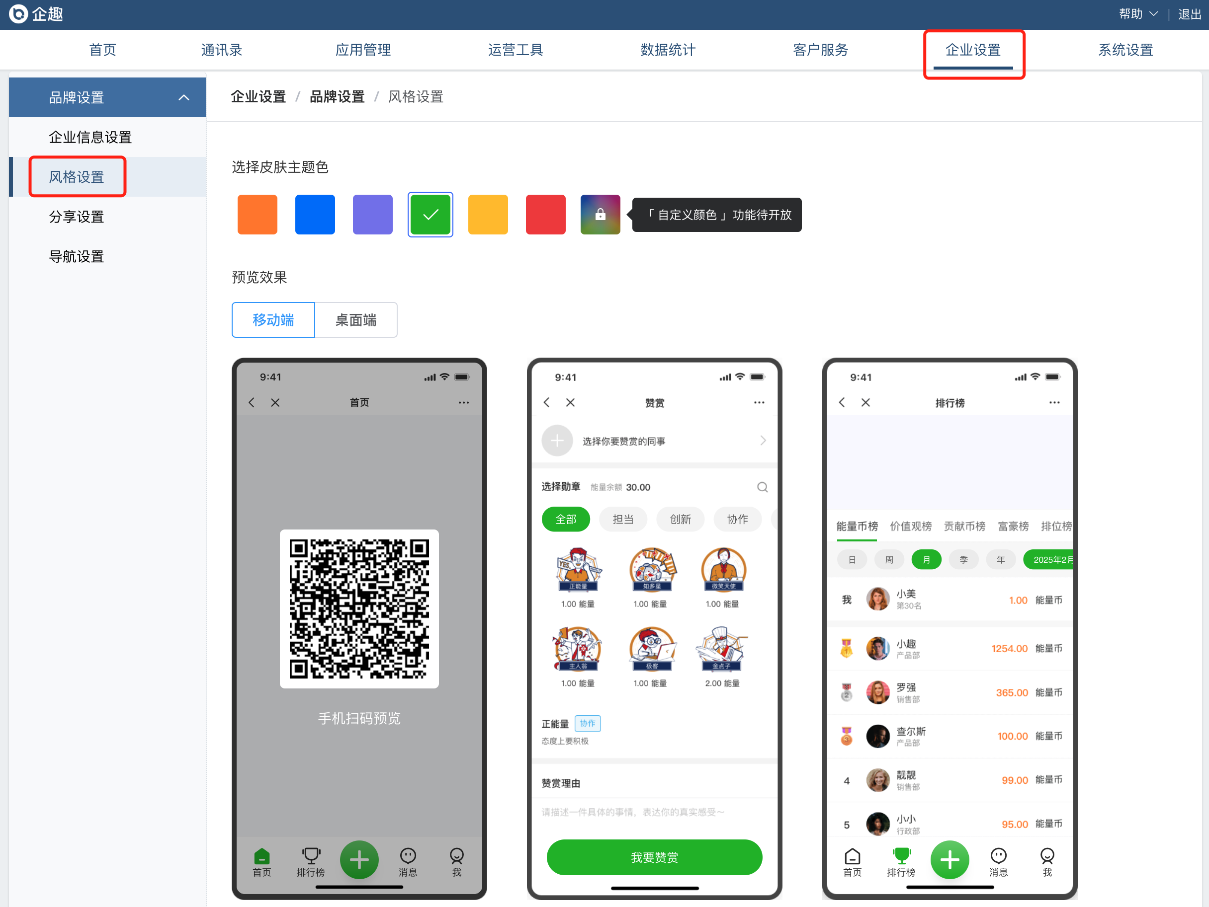 ②增加企业设置,专业版支持配置员工端皮肤主题色和导航内容
