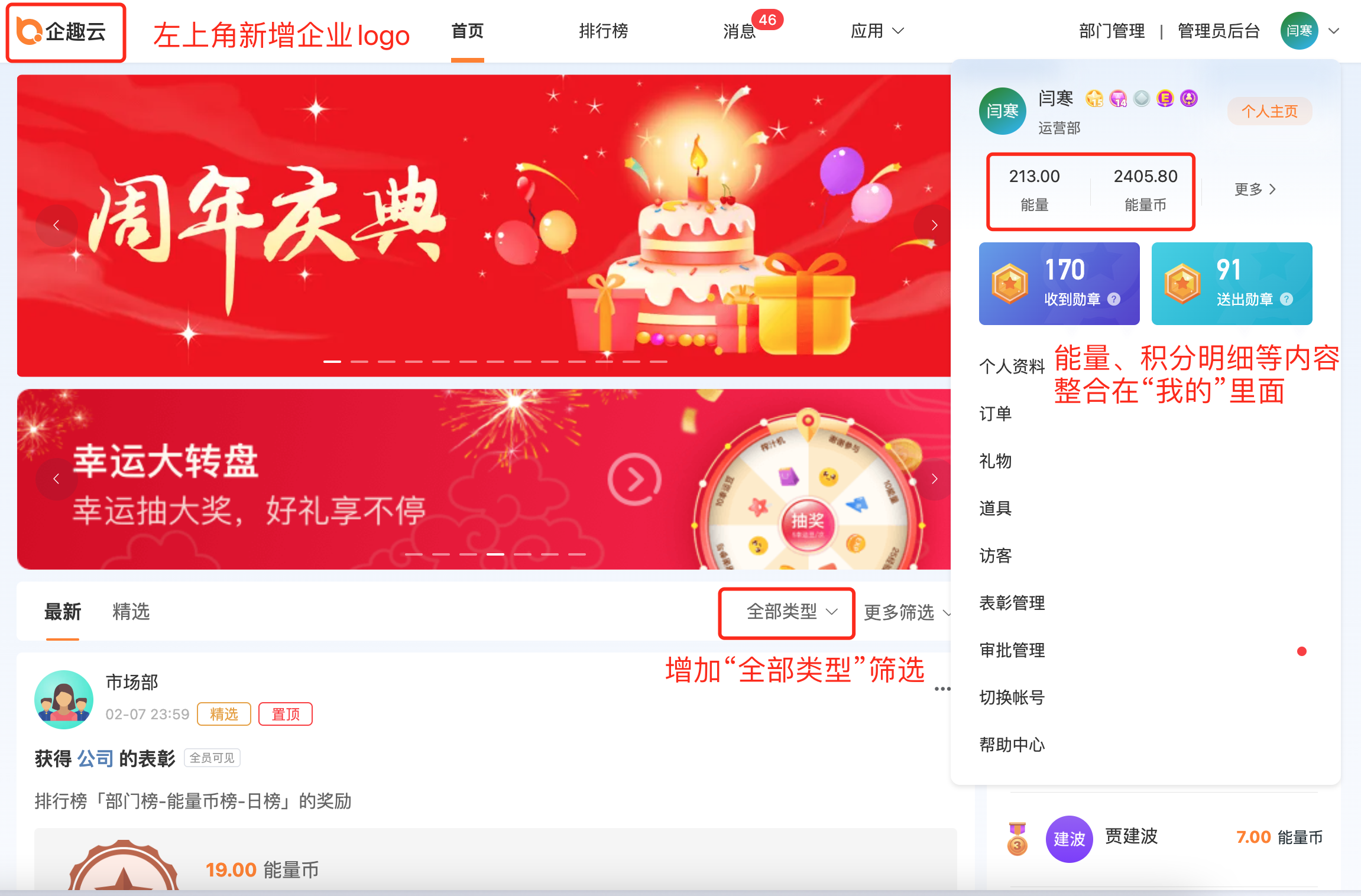 ①员工PC端改版升级;