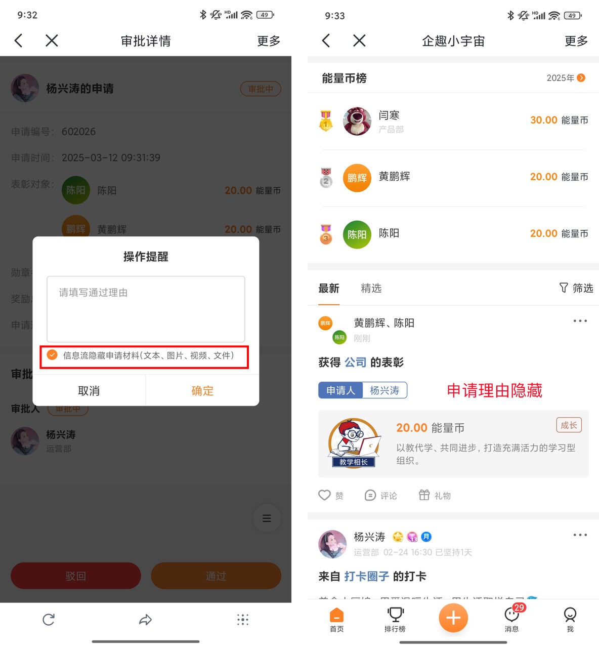 申请表彰审批时,可以选择在信息流中隐藏申请理由、图片、视频、文件