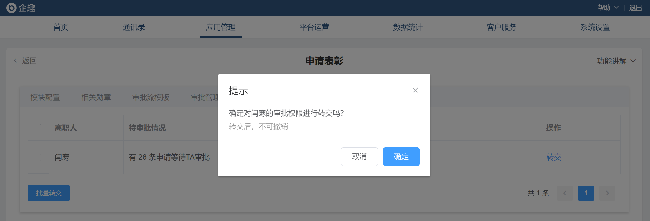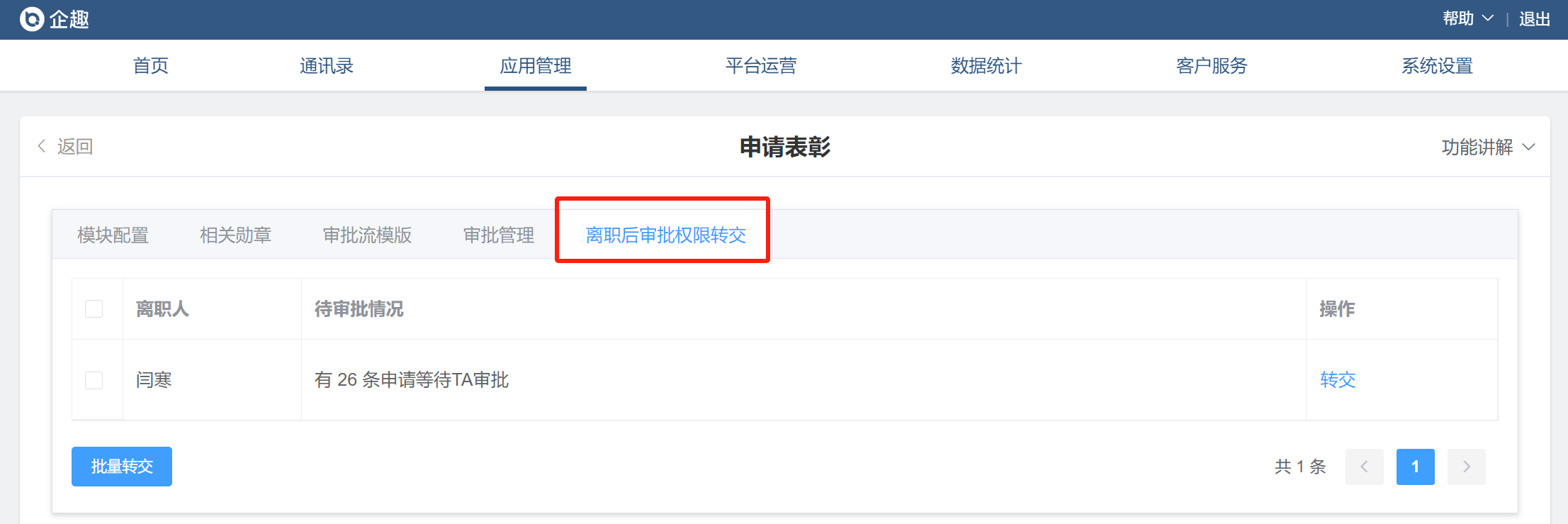 ③申请表彰新增审批人离职后审批权限转交