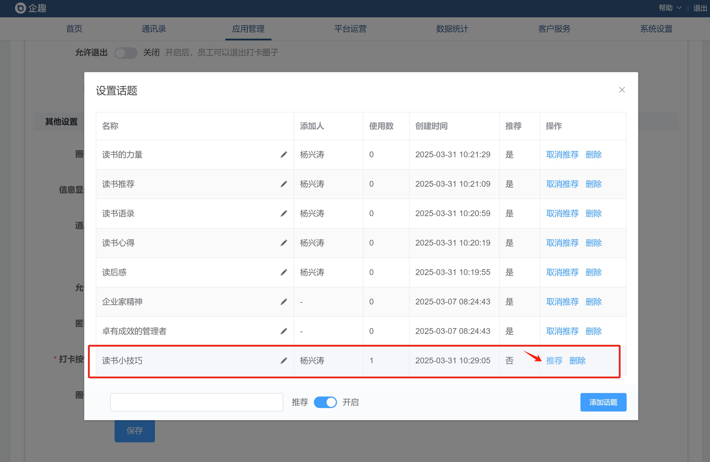 管理员后台可以把员工创建的话题,设置为推荐话题