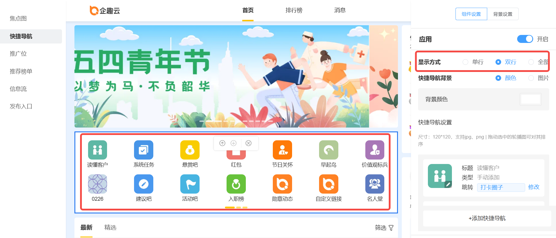 应用功能外显,并可在管理员后台设置显示方式:单行、双行、全部。