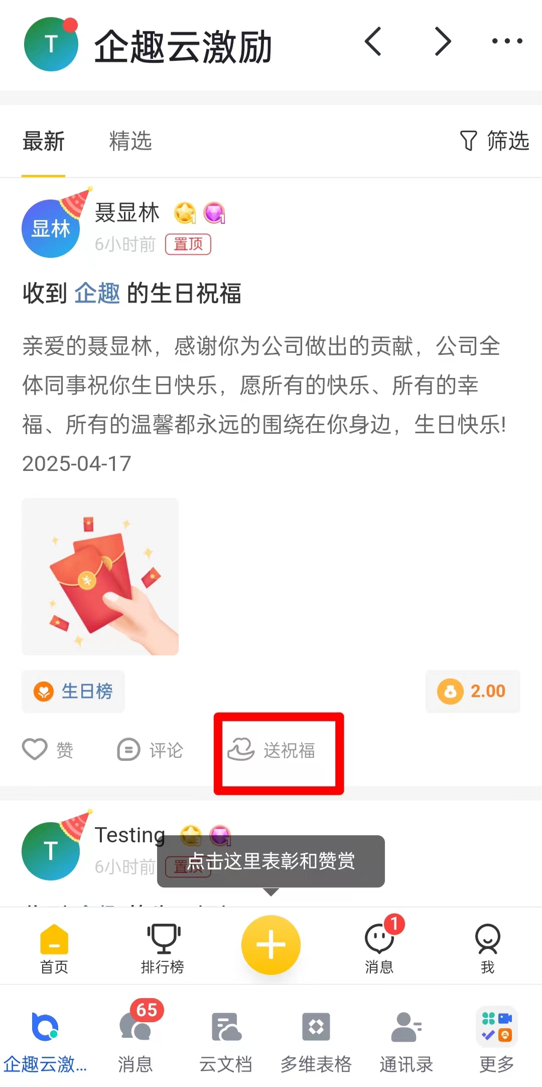 ⑥ 生日/入职榜信息流里增加送祝福功能
