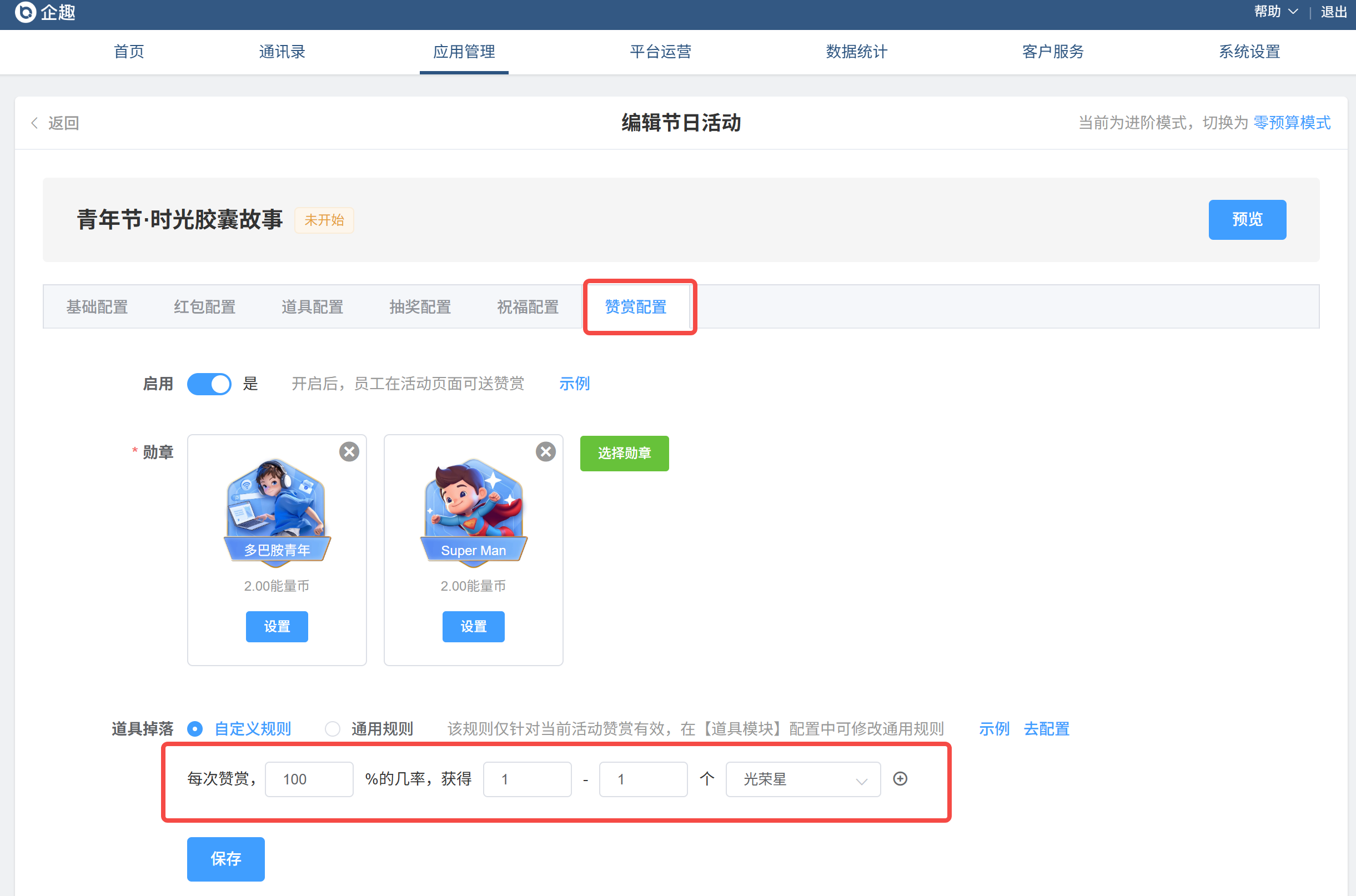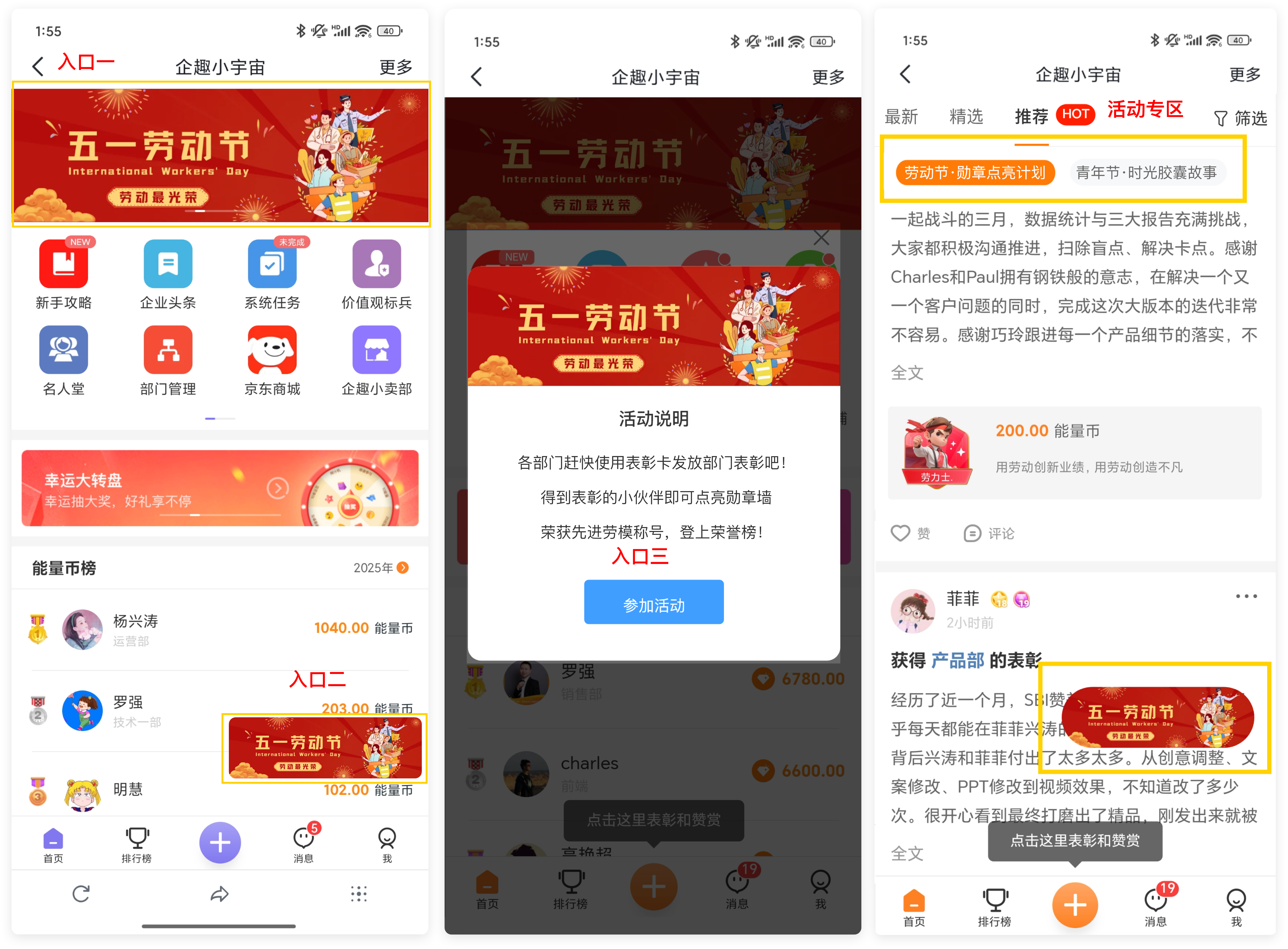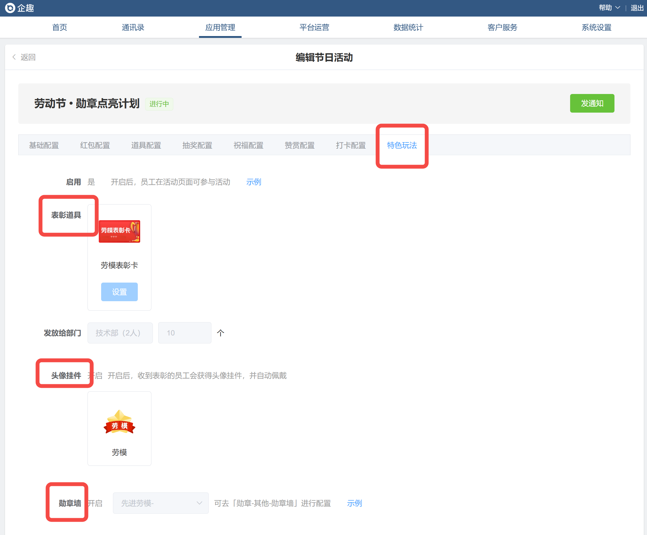 部门负责人可以使用劳模表彰卡发出部门表彰,收到表彰的员工佩戴劳模挂件登上活动页面光荣墙,并且在个人主页点亮勋章墙。