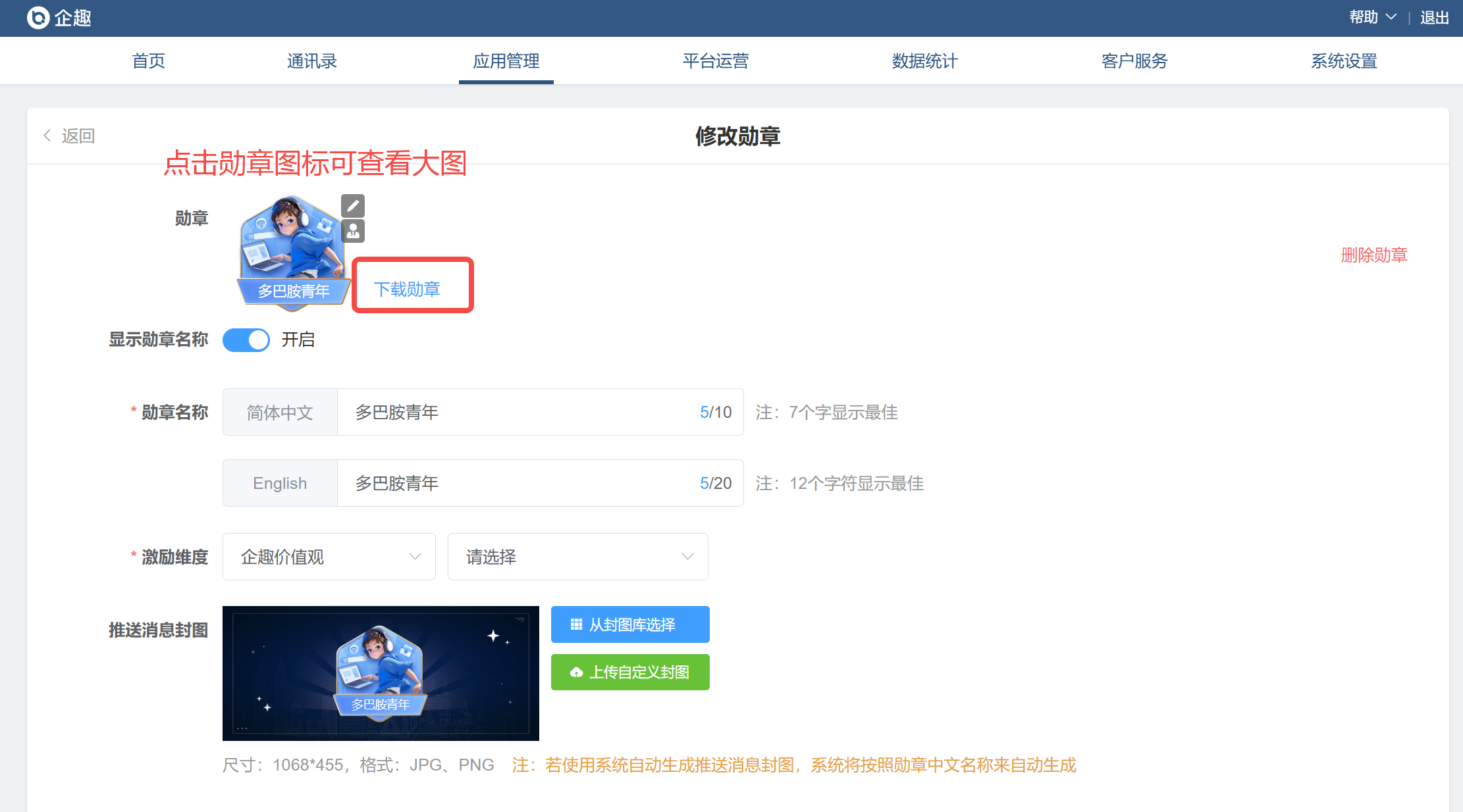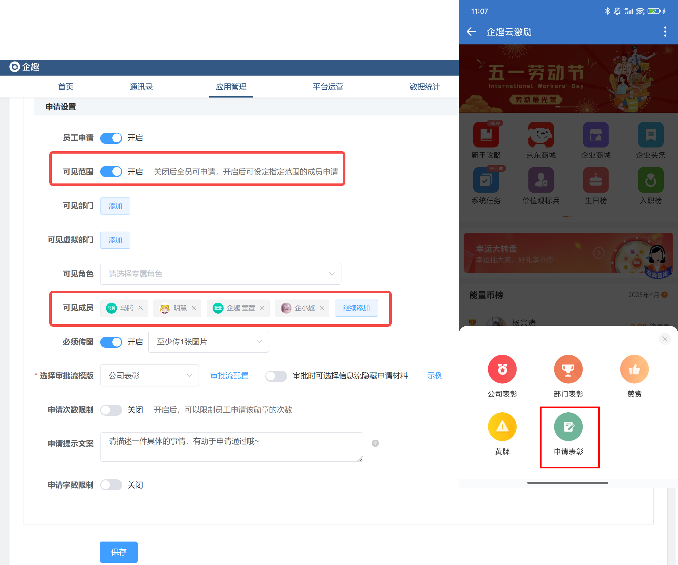 ⑤ 申请表彰入口,仅勋章可见范围内成员可见