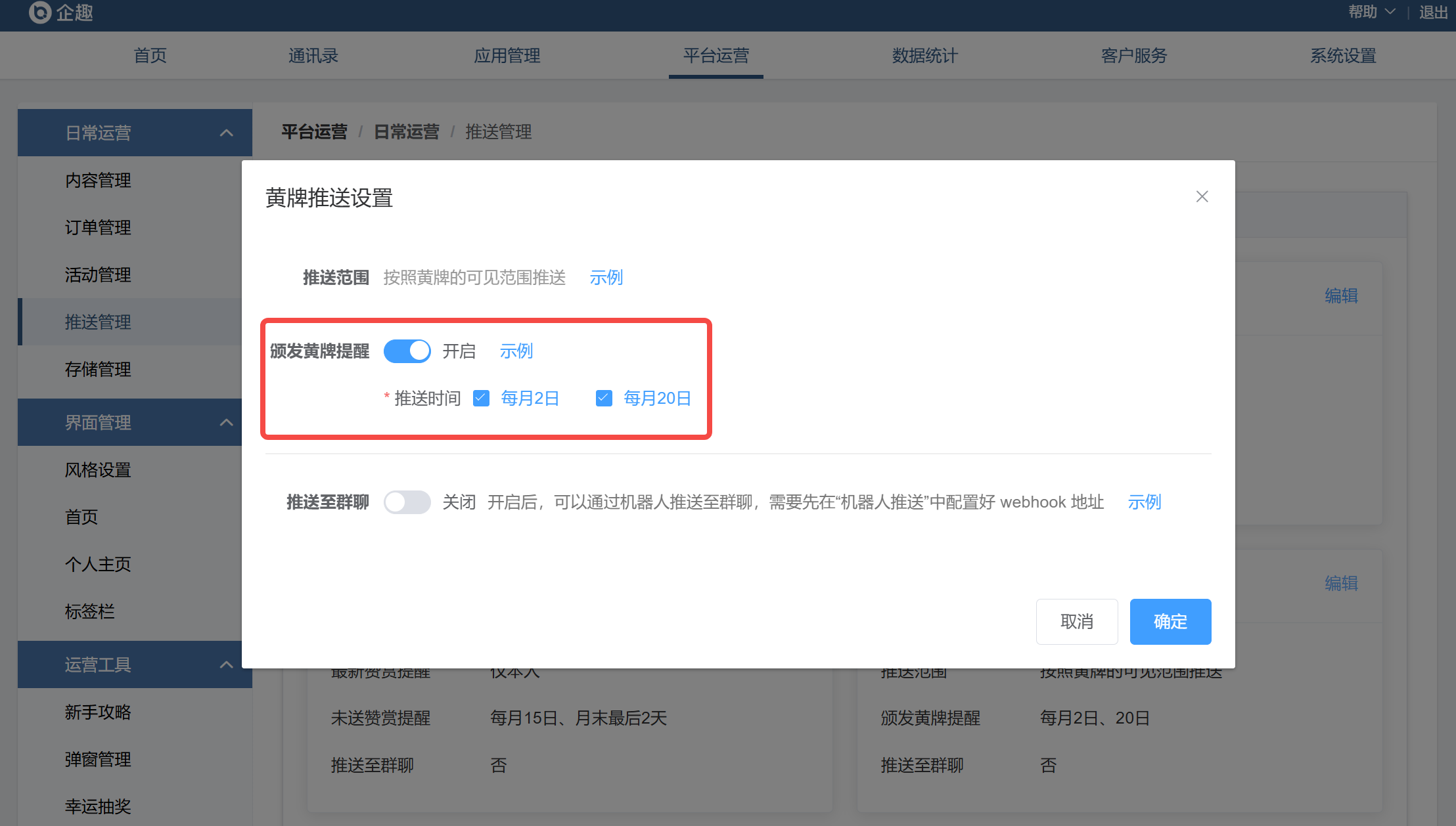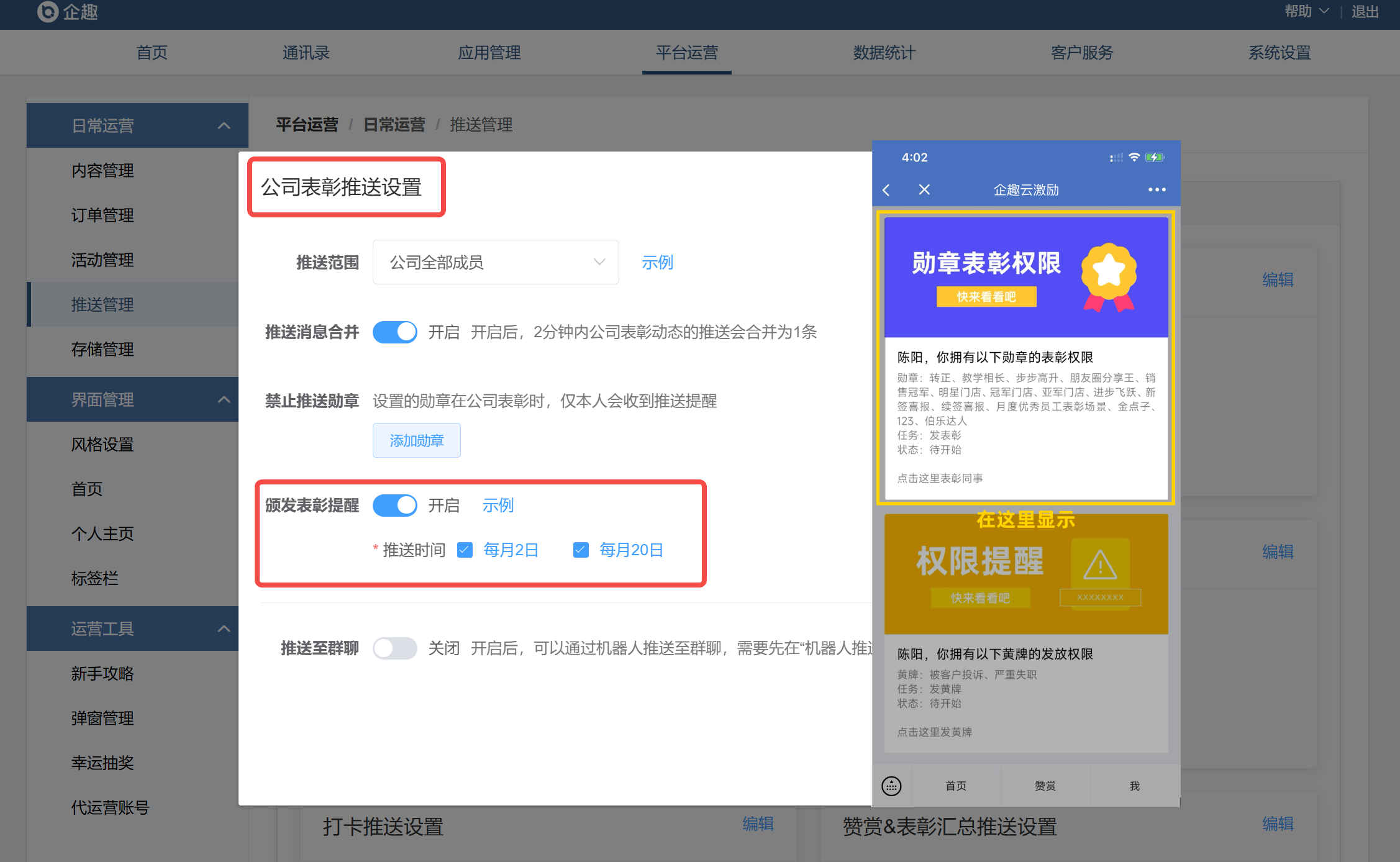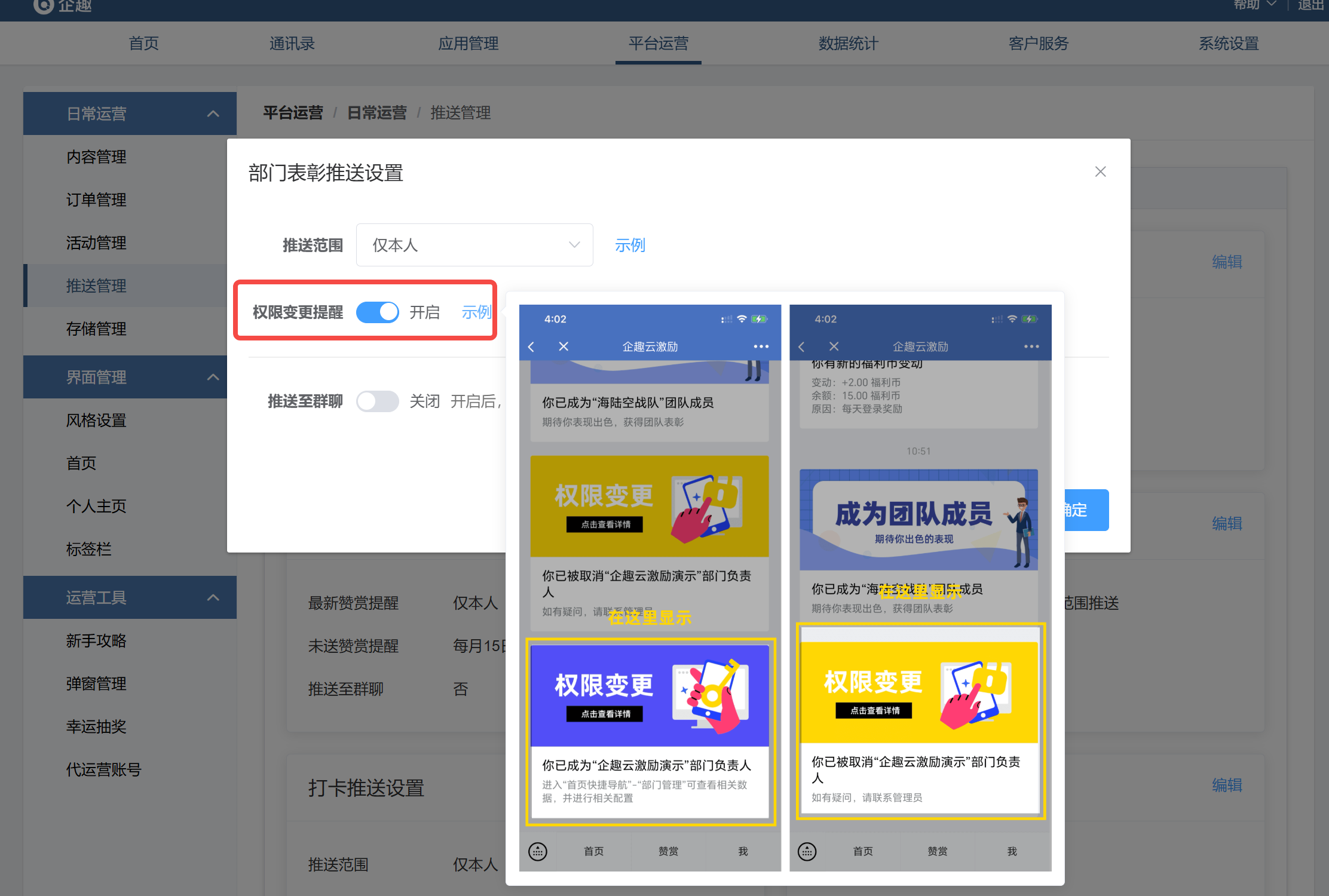 公司表彰和黄牌推送设置中,颁发表彰提醒新增推送时间选择;部门表彰推送设置中权限变更提醒支持关闭。