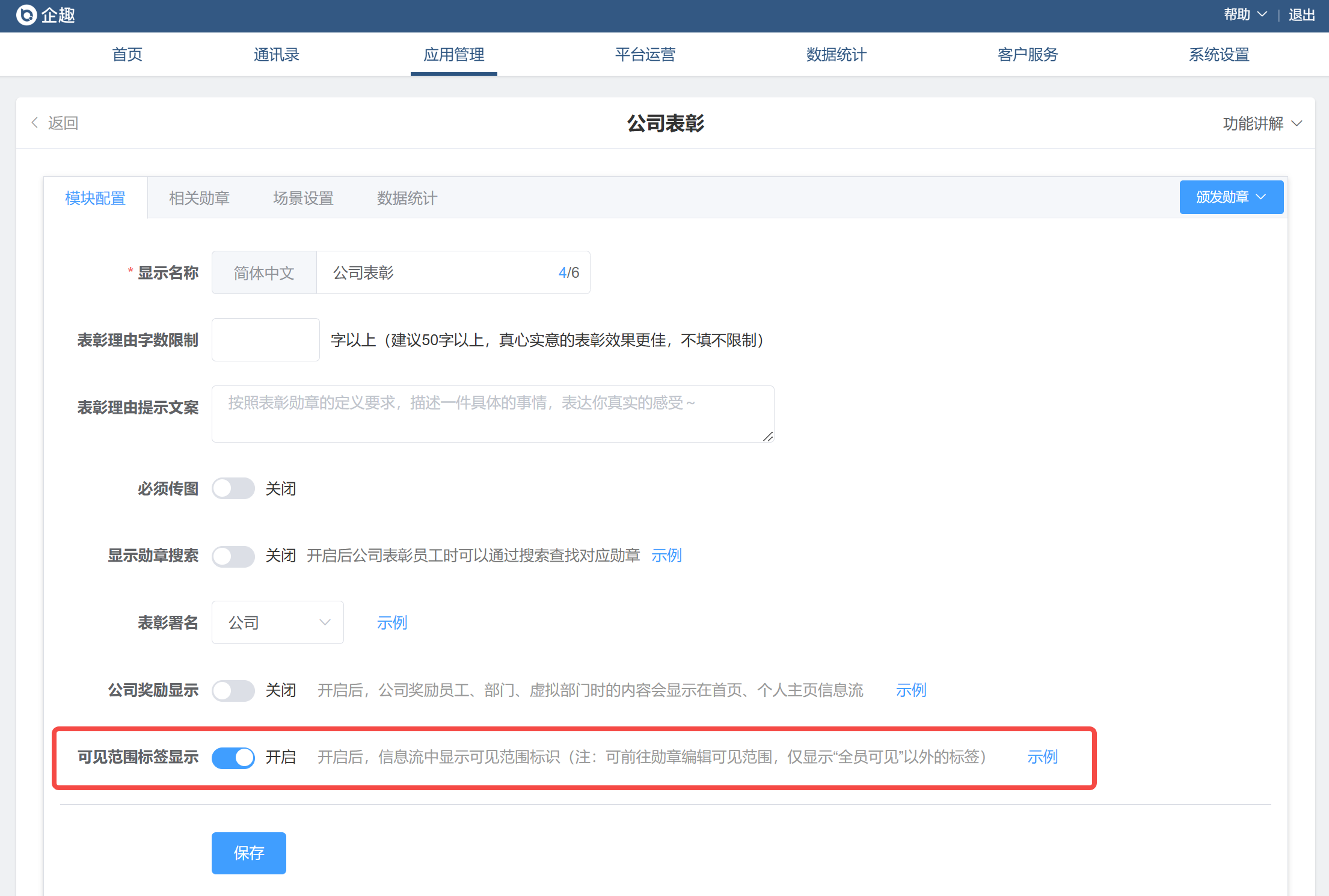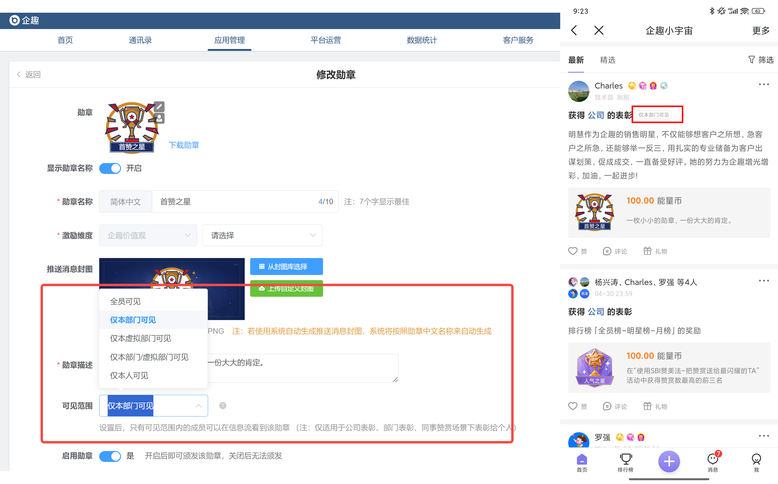 公司表彰、部门表彰、同事赞赏中的勋章可见范围,在非全员可见时显示可见范围标签。