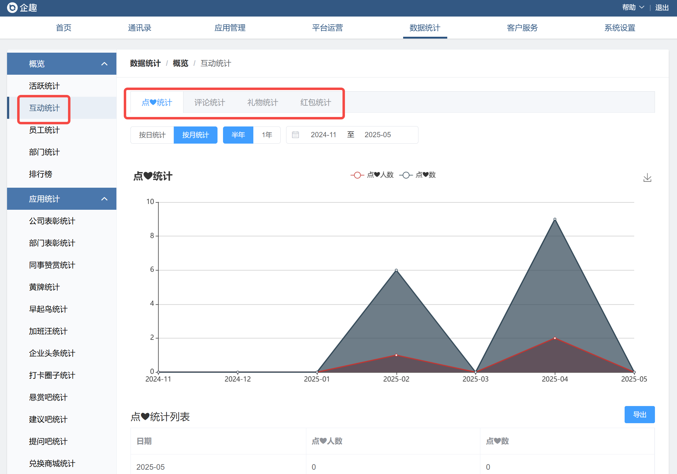 数据统计新增点心统计和评论统计,与礼物统计和红包统计合并为互动统计,方便查看