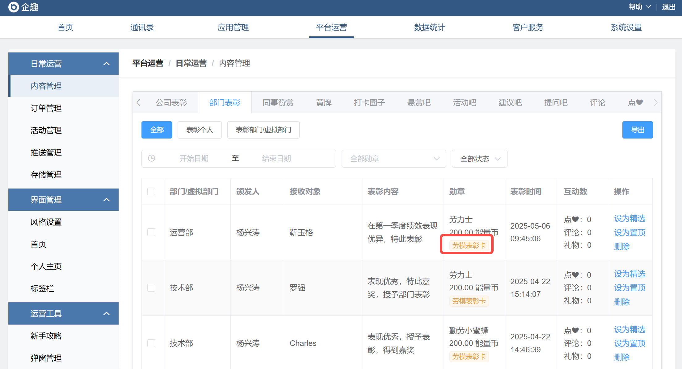 部门表彰中使用表彰卡道具进行表彰时,管理员后台会显示表彰卡标识