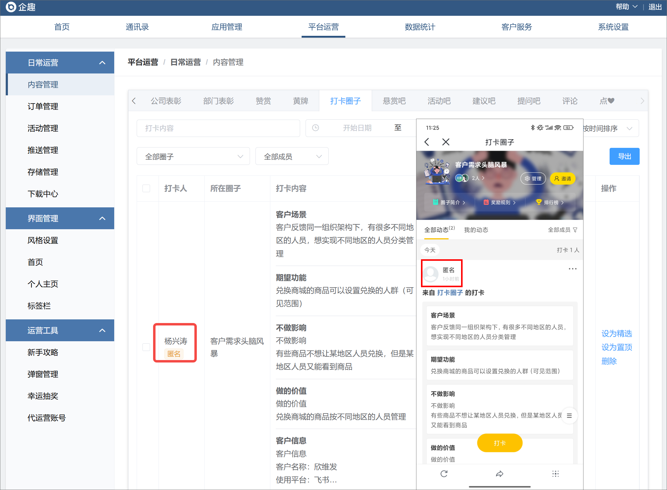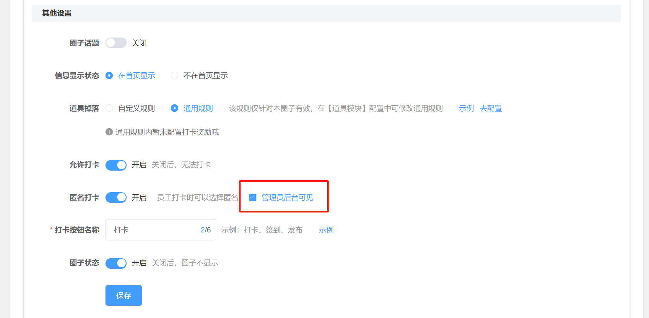 匿名打卡时,员工端显示匿名,管理员后台可以设置能够看见打卡人。