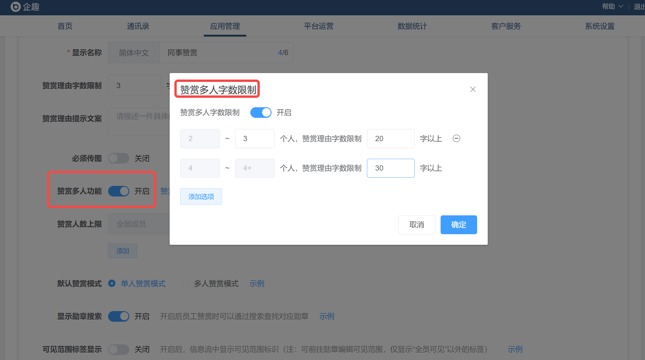 可以设置赞赏更多人数时,赞赏理由必须在规定字数以上。