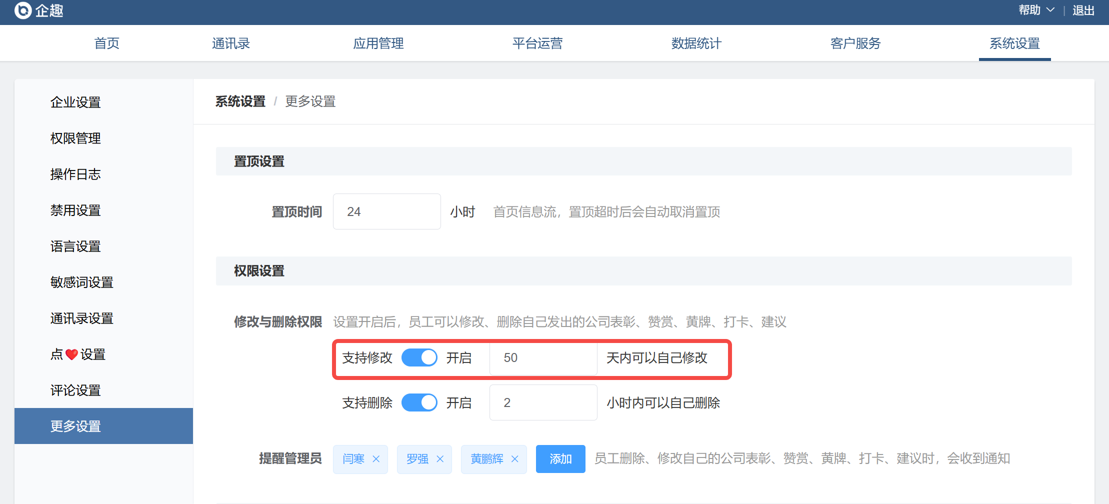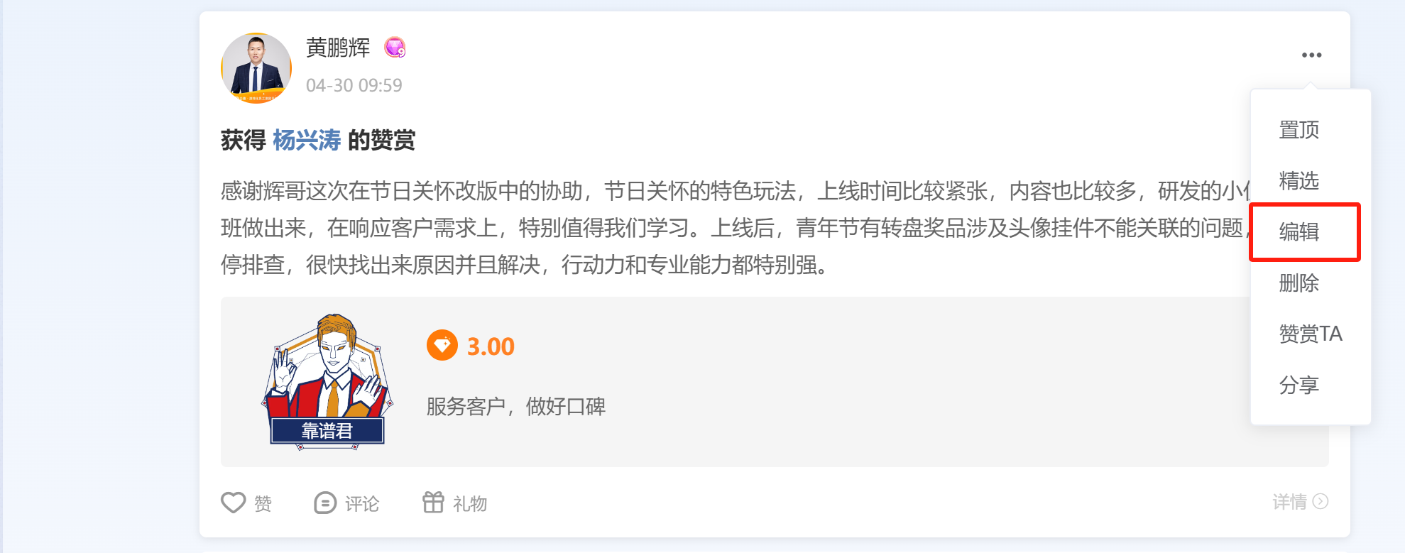 管理员后台开启可以修改自己发出的赞赏、打卡内容时,电脑端新增编辑选项。