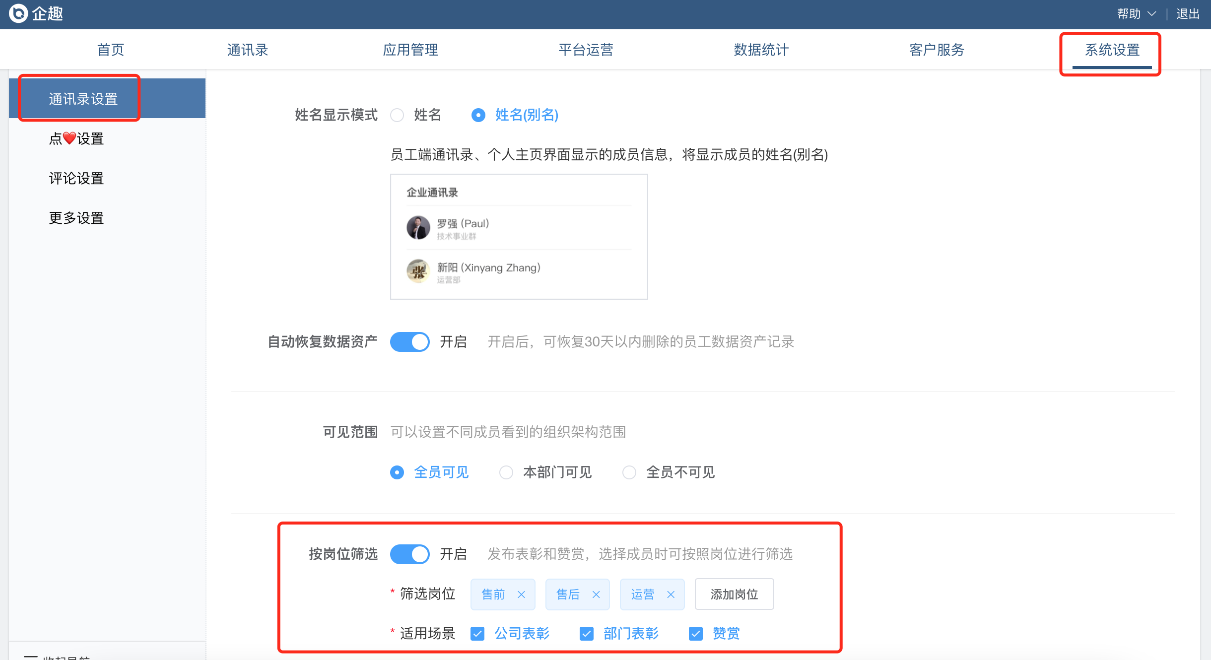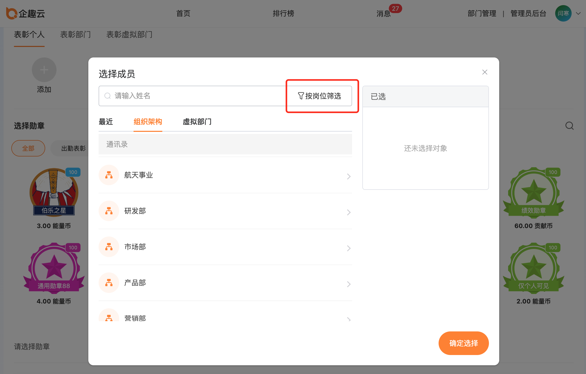 ②发布表彰和赞赏,选择成员时可按照岗位进行筛选