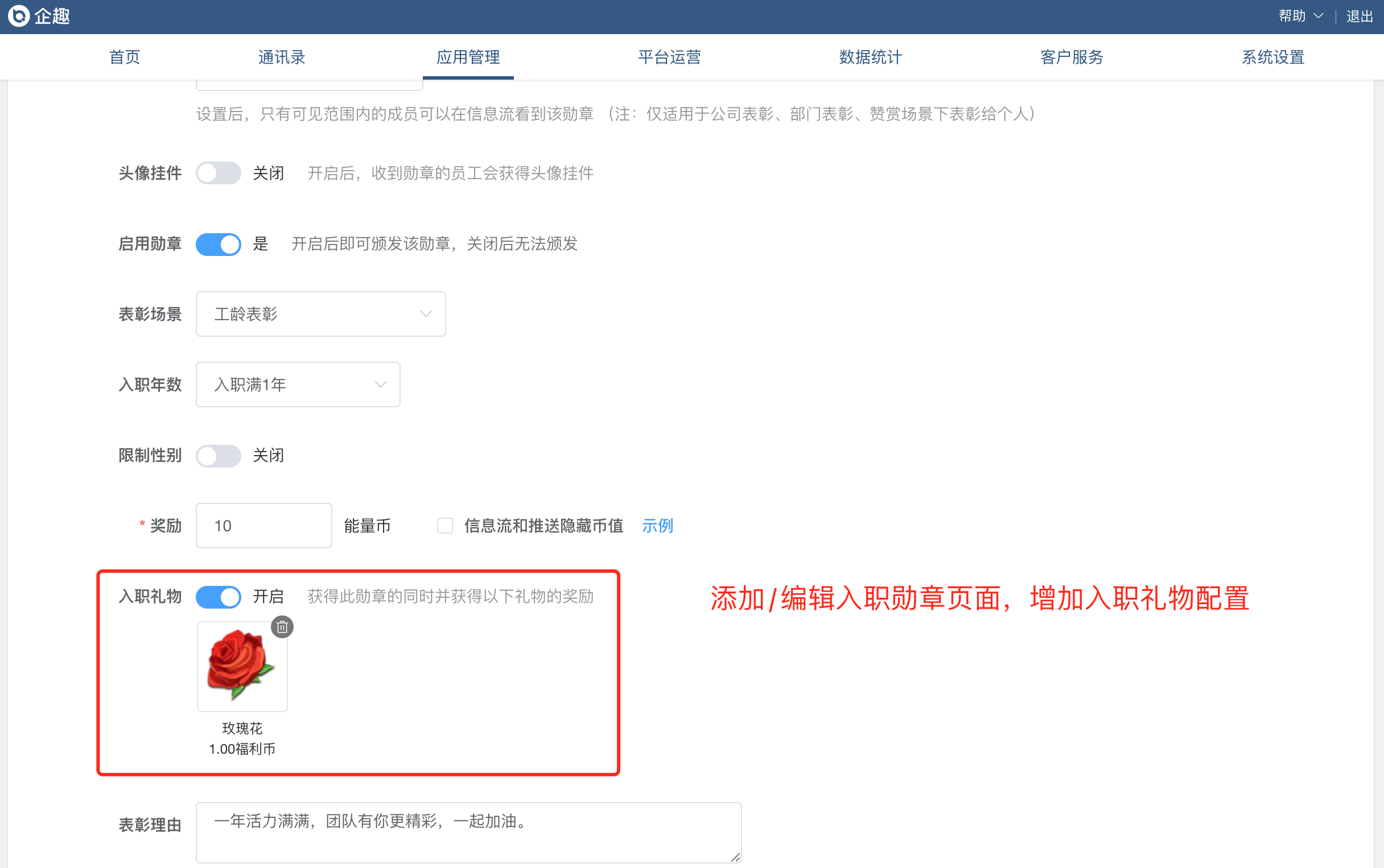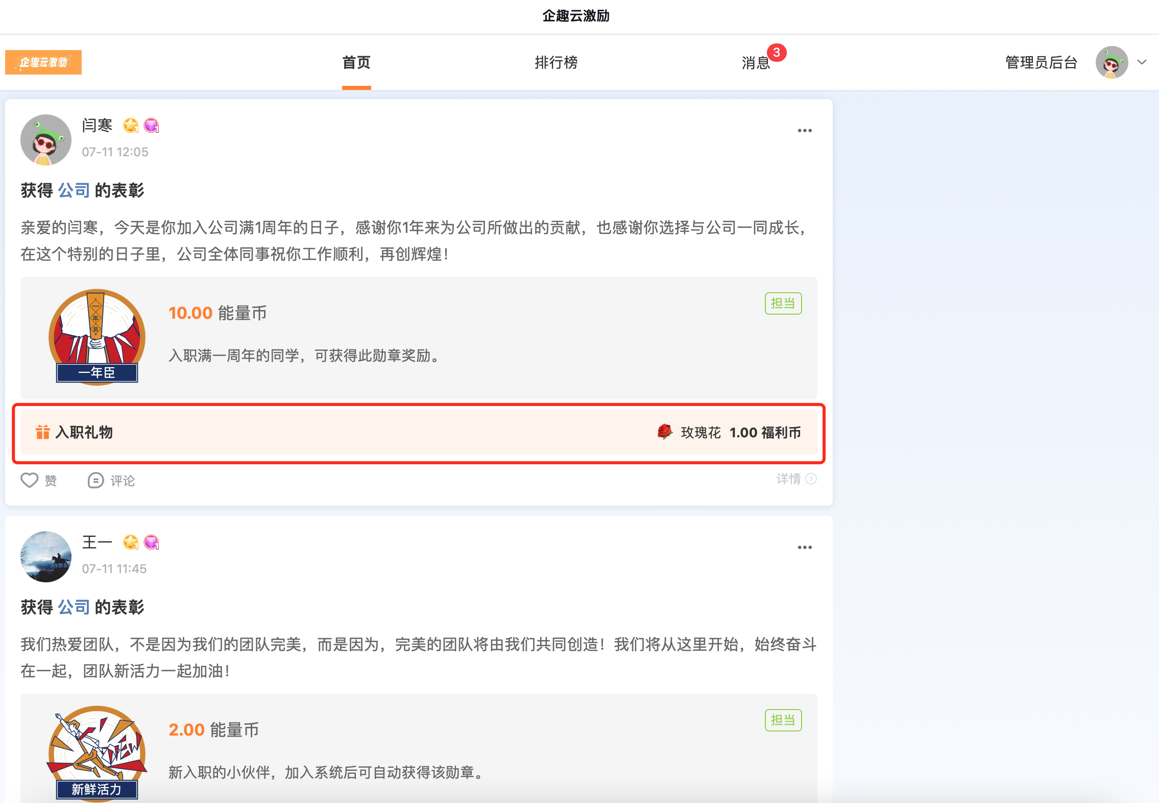 ①入职榜勋章支持配置奖励入职礼物
