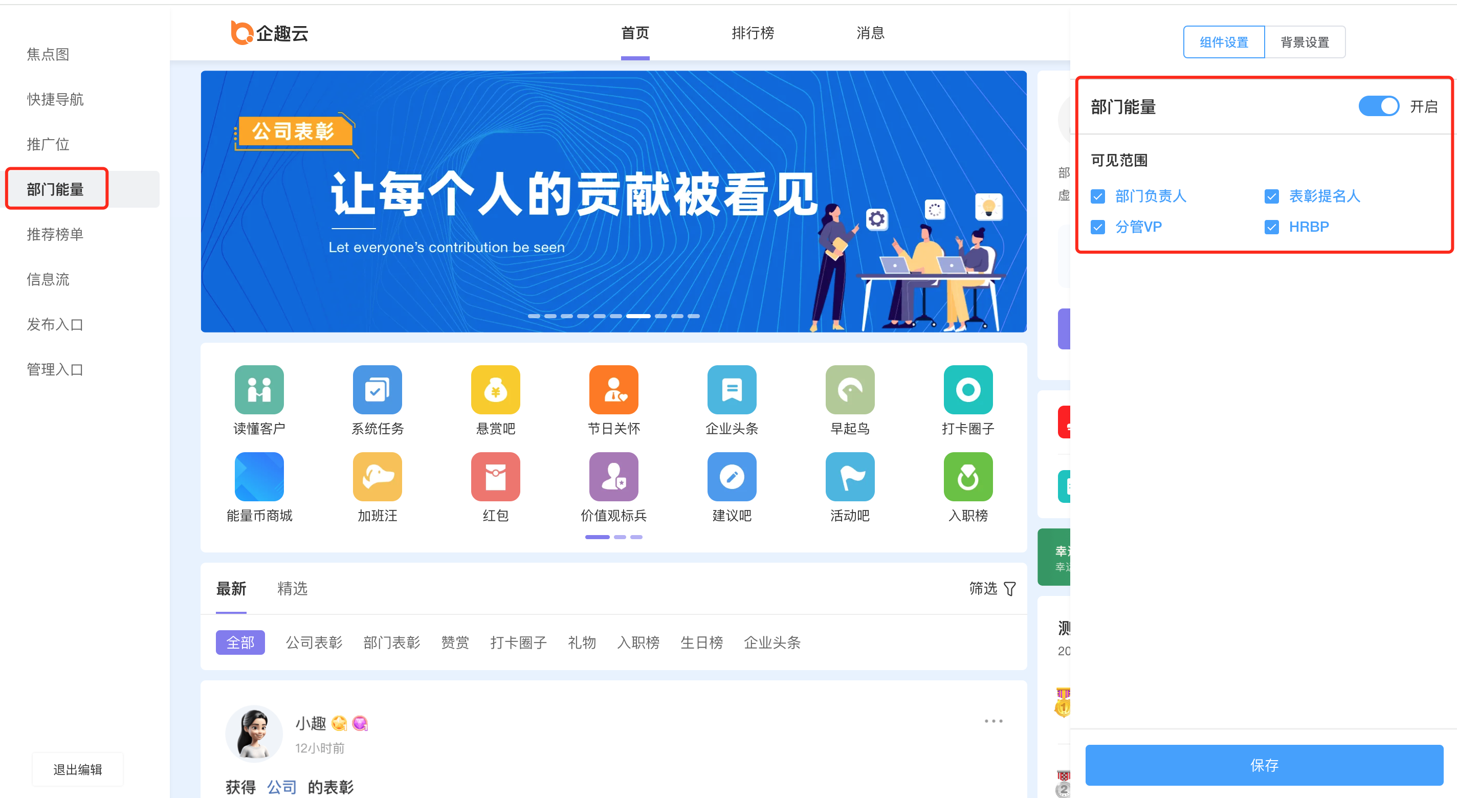 管理后台,平台运营-界面管理-首页,配置电脑端,可配置部门能量的可见范围。